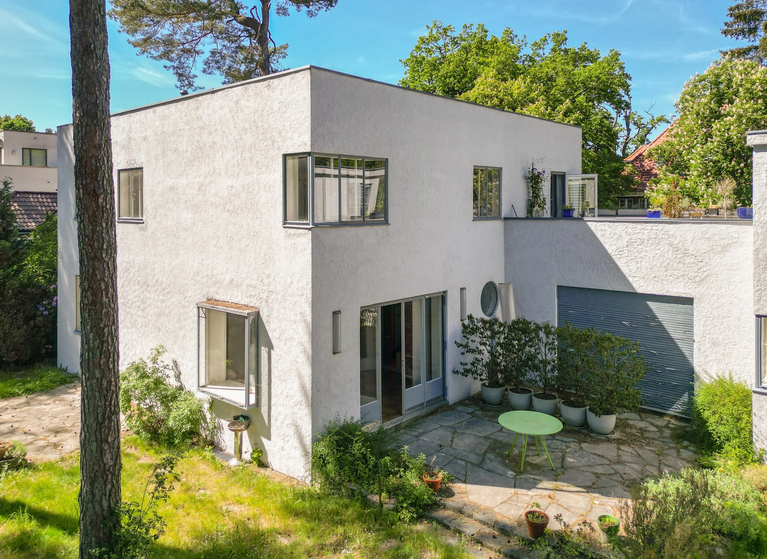 Key features include flush-mounted steel windows, flat roofs, roof and garden terraces, and a strong orientation toward sunlight, all of which reflect the principles of Neues Bauen. Making deliberate use of the site’s topography, Behrens embedded the elongated structure into the terrain, creating a raised basement on the street side. This level accommodates the entrance to the auxiliary apartment as well as two garages. As a result, the living spaces of both apartments open at ground level directly onto the garden through wide glazed doors.