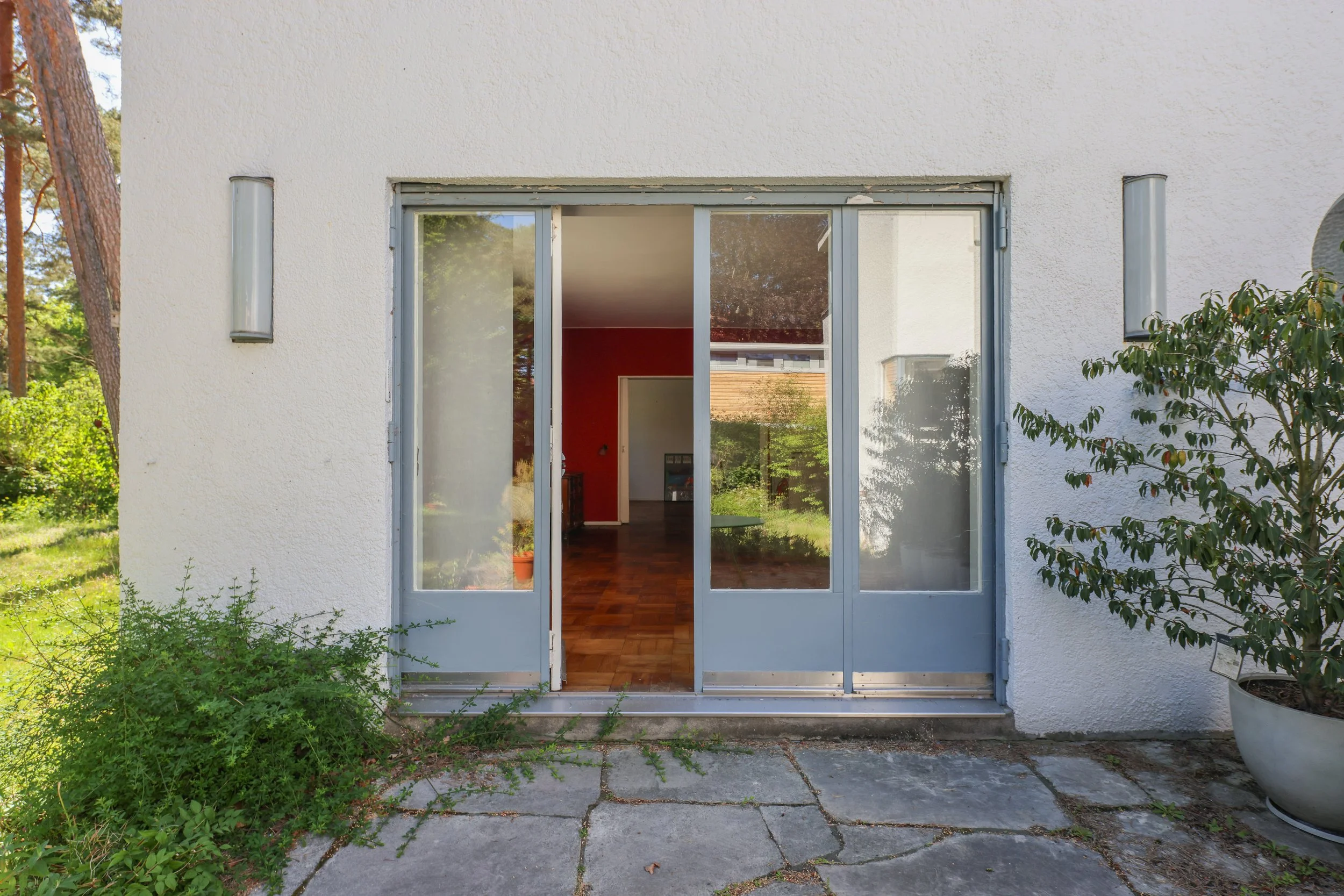 Exit from the living room into the garden with original doors and outdoor lamps
