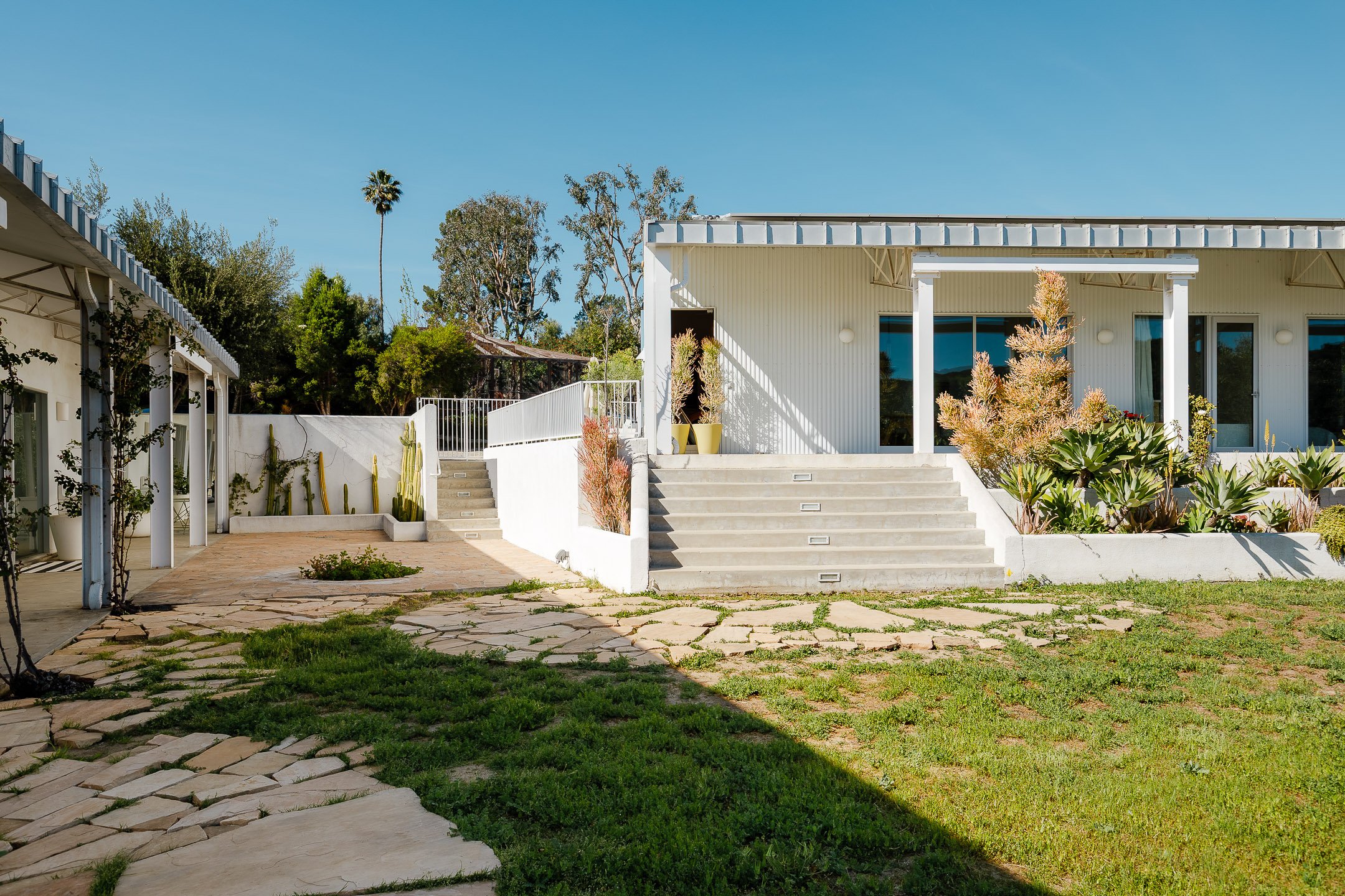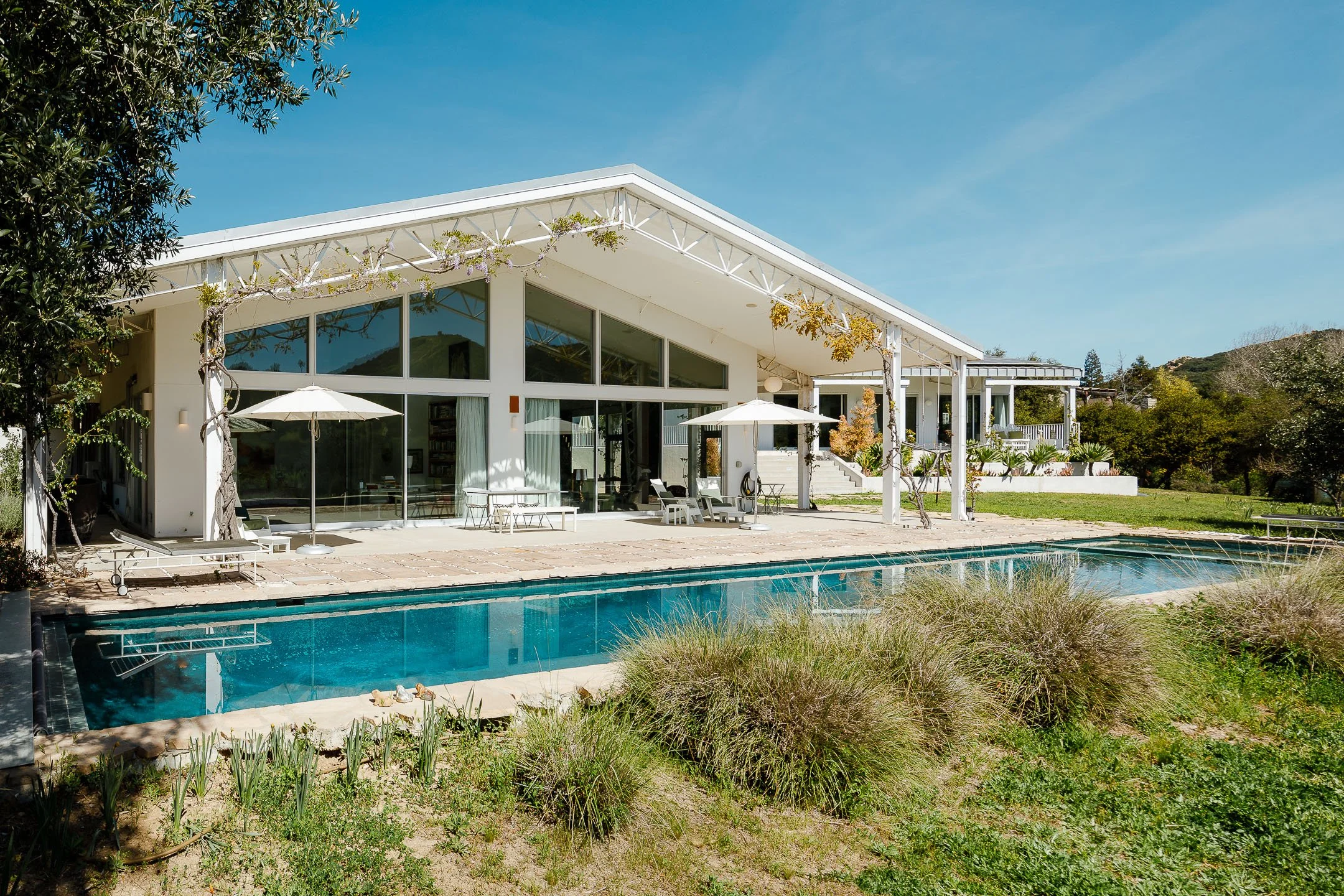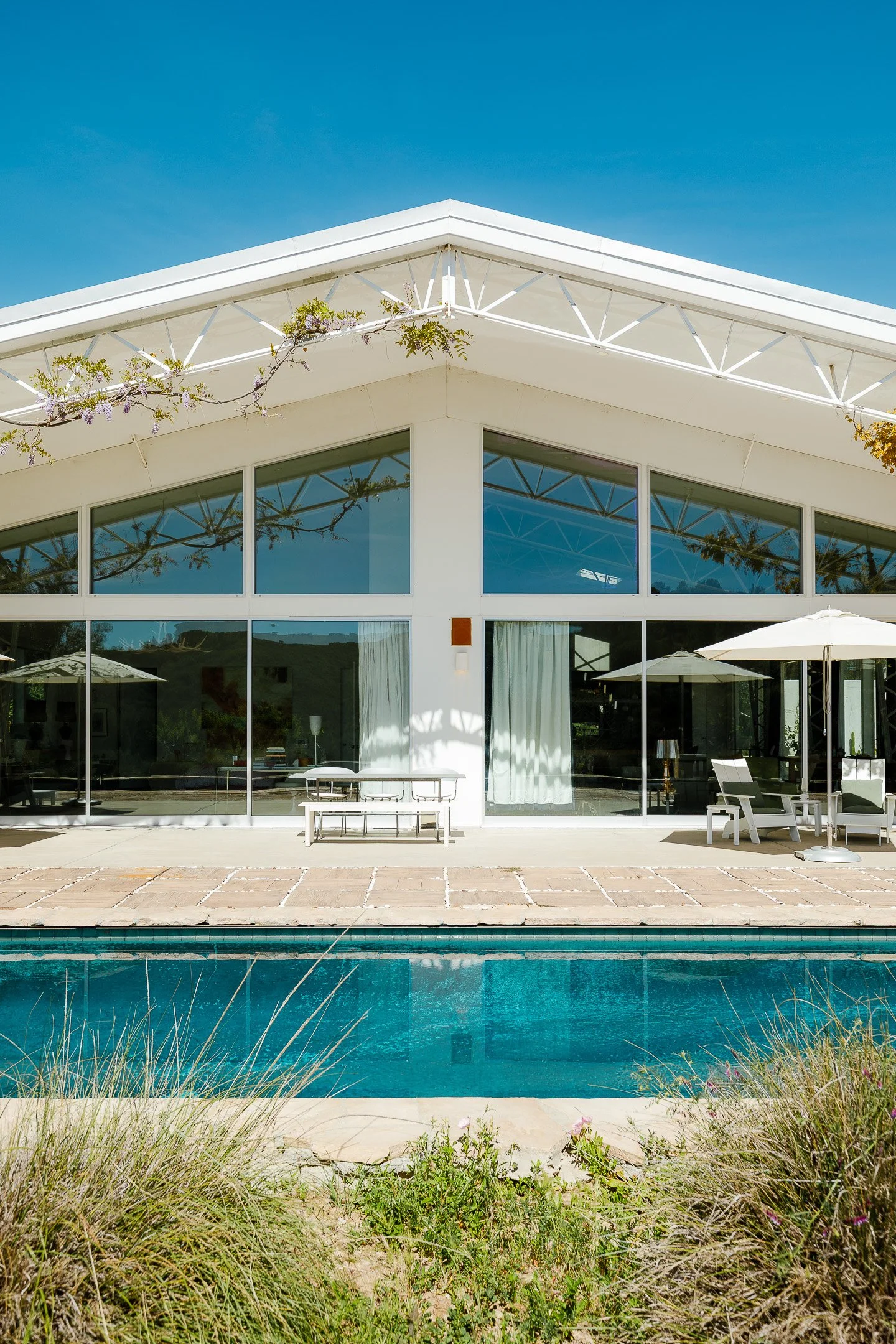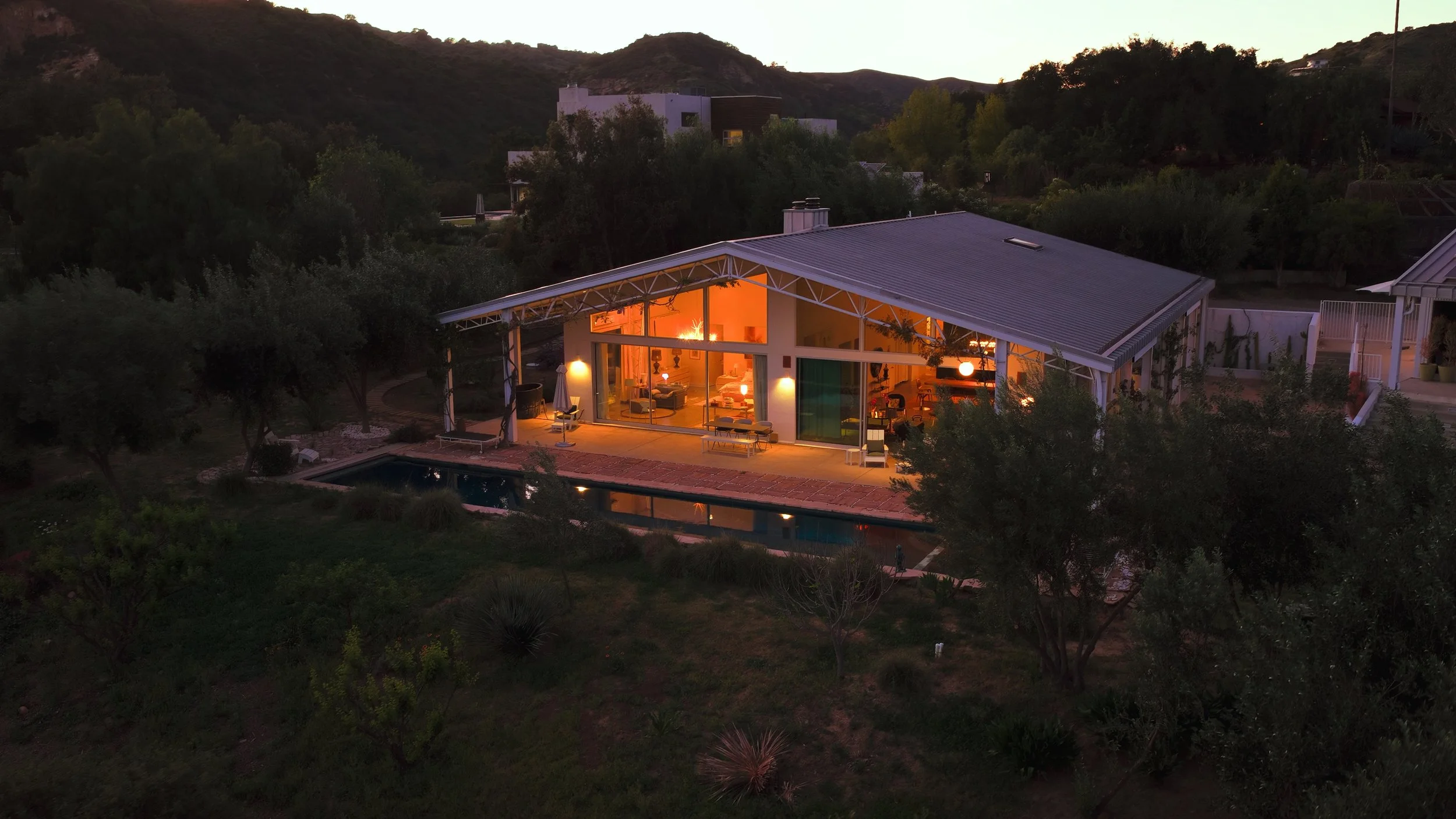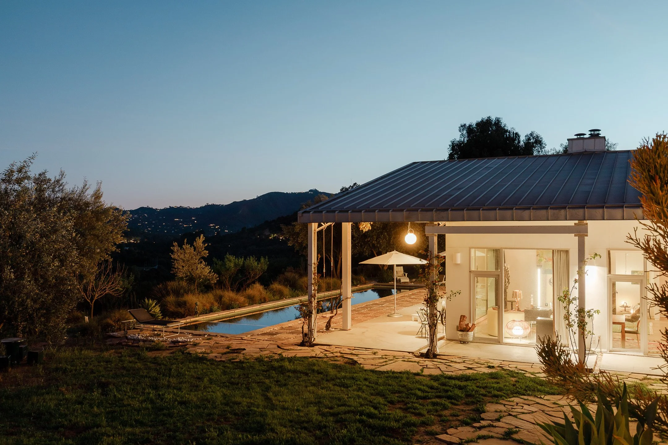 At the top of the hill, on an extraordinary 60,000 sqft site with panoramic views of the canyon and rolling hills, sits this architectural estate designed in 2007 by Barbara Bestor. Two buildings are positioned side by side, forming an entrance promenade and an open patio between them. The main house, spanning 3,951 sqft, features expansive double-height spaces and an open floor plan. It is only partially divided by a series of walls that define the primary bedroom and bathroom, as well as a loft with several office/bedroom spaces and an additional guest suite with its own kitchen. All rooms on the main level have direct access to the outdoors with private garden areas. The main living area, including the kitchen and dining, shares a double fireplace with the adjacent primary bedroom. Both face a pool that runs the length of the house and overlooks the canyon. A 12-foot-deep shaded porch creates a transitional space between indoors and outdoors, ideal for lounging and embracing a daytime outdoor lifestyle. The guesthouse, or "Moon Suite" (679 sq ft), is a fully independent unit with a bedroom, bathroom, kitchen area, and living room - all oriented towards the view. At the rear of the structure, there is also a large studio with storage space that could be used as a 3-4 car garage. The owners' desire for a sustainable home led to the use of structural steel trusses and a custom-adapted prefabricated system, allowing for wide spans and open spaces. Passive temperature control supports year-round heating and cooling (now supplemented by additional AC units), while large custom windows are coated with a low-emissivity transparent metallic film. The white metal facade reflects light, reducing heat gain. The house features very high ceilings inspired by vernacular agrarian shed structures and includes solar panels, radiant heating, and a variety of peach, pear, and olive trees on the property. This special compound, offering multiple possibilities for an artist/wellness retreat, is on the market for the first time and represents one of the few sustainable designs by Barbara Bestor ever available for sale.