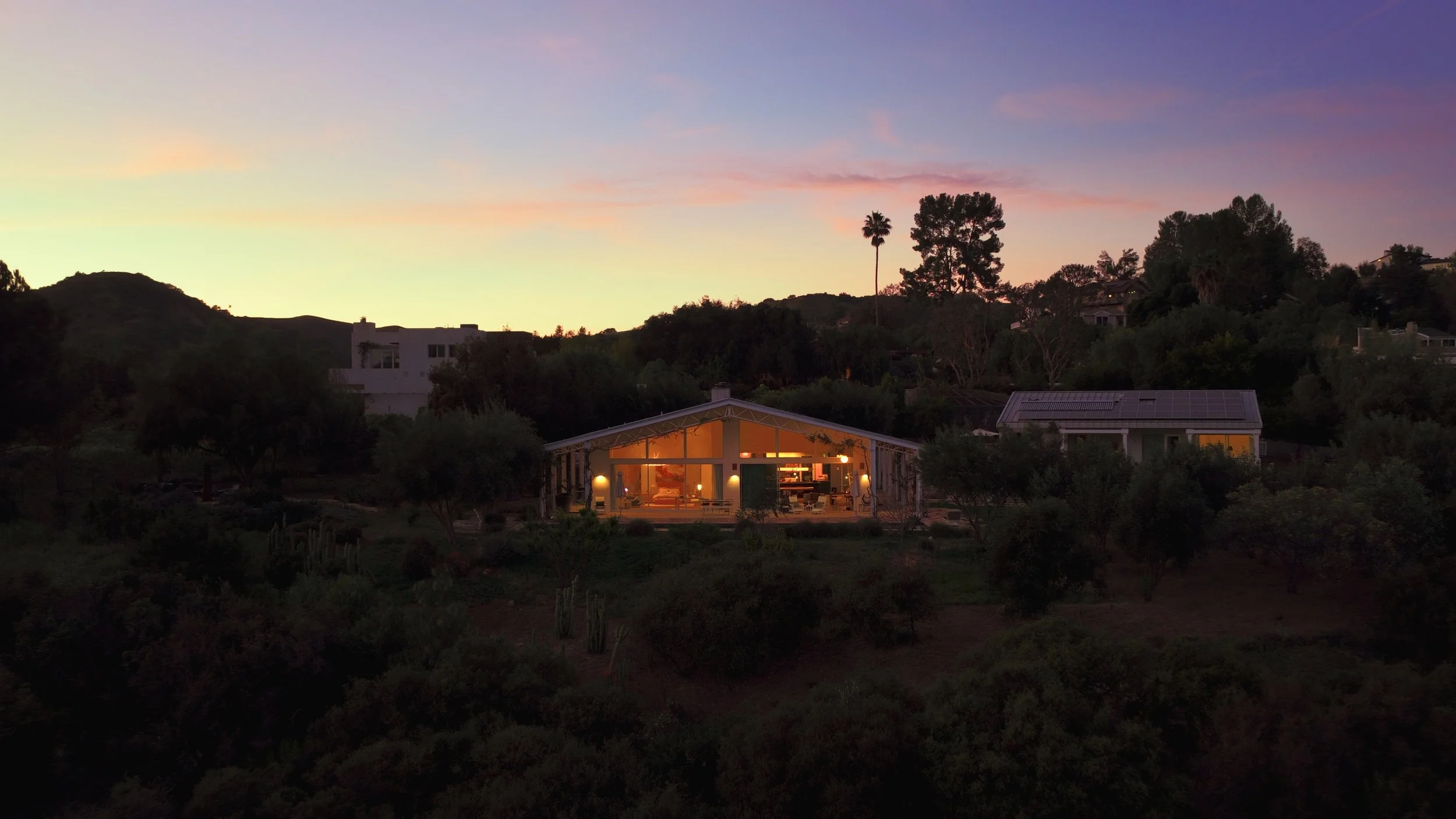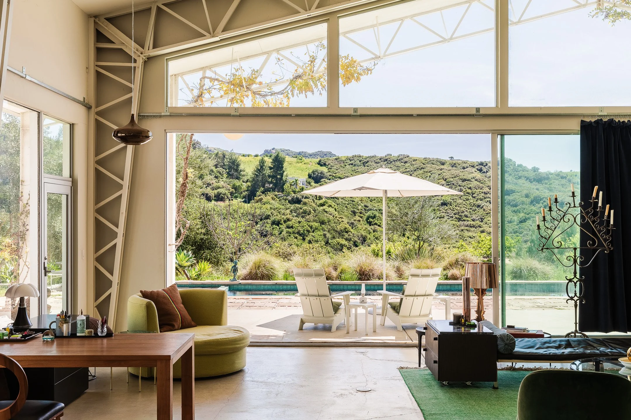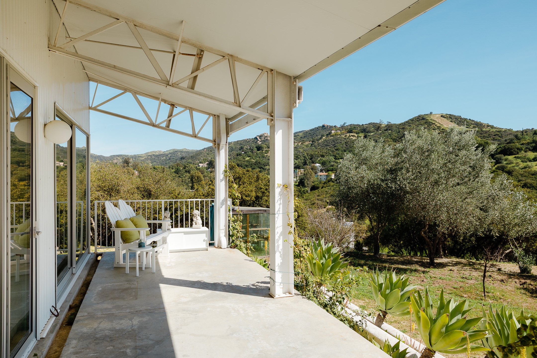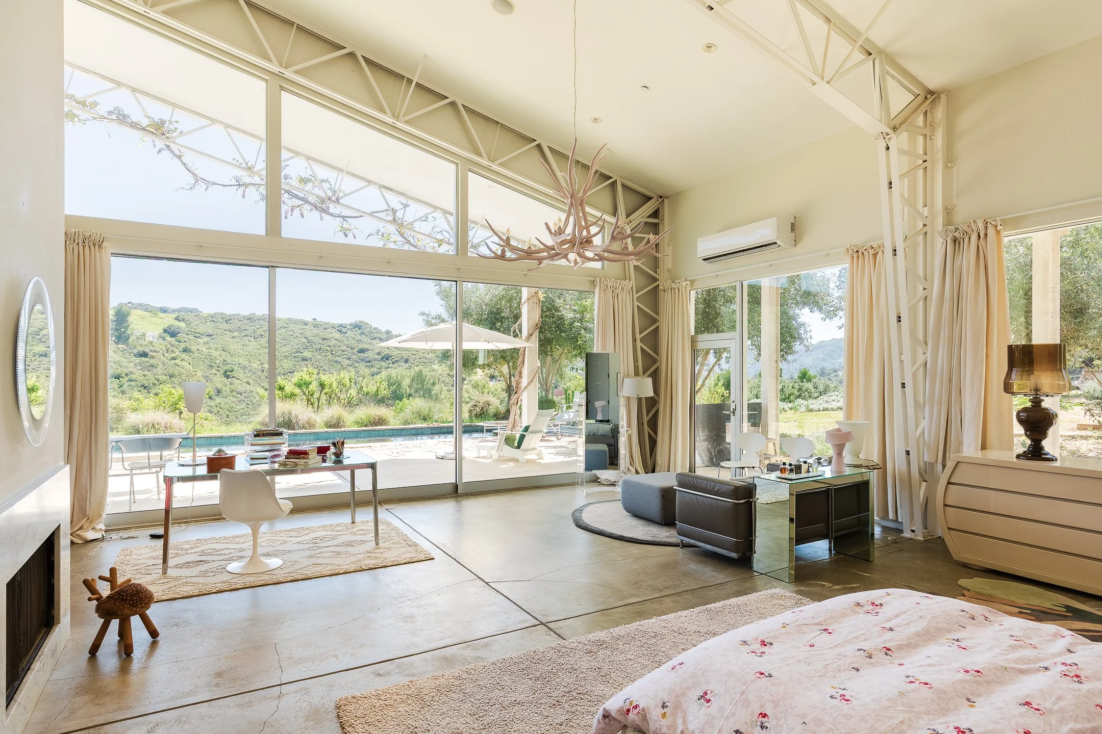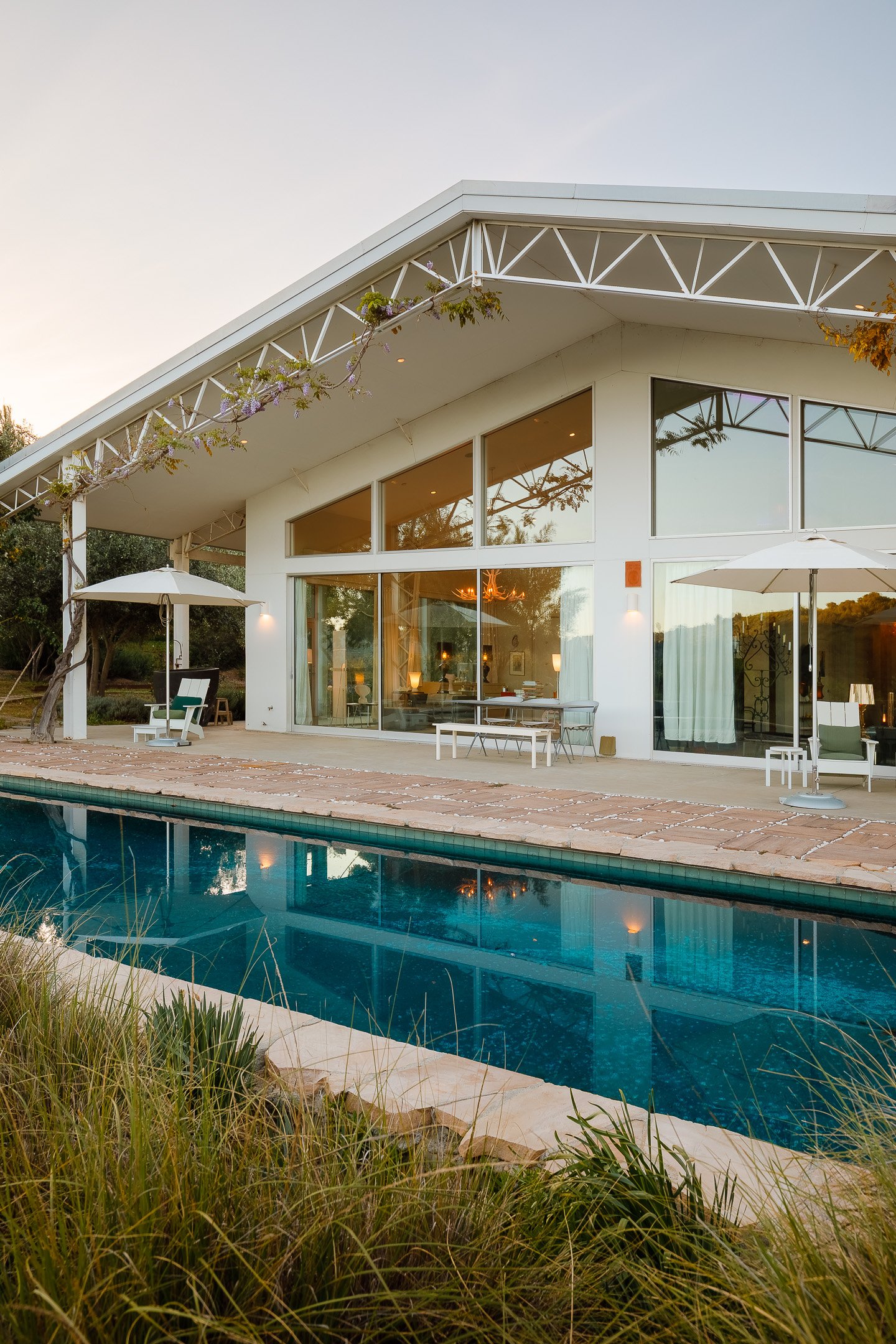 At the top of the hill, on an extraordinary 60,000 sqft site with panoramic views of the canyon and rolling hills, sits this architectural estate designed in 2007 by Barbara Bestor. Two buildings are positioned side by side, forming an entrance promenade and an open patio between them. The main house, spanning 3,951 sqft, features expansive double-height spaces and an open floor plan. It is only partially divided by a series of walls that define the primary bedroom and bathroom, as well as a loft with several office/bedroom spaces and an additional guest suite with its own kitchen. All rooms on the main level have direct access to the outdoors with private garden areas. The main living area, including the kitchen and dining, shares a double fireplace with the adjacent primary bedroom. Both face a pool that runs the length of the house and overlooks the canyon. A 12-foot-deep shaded porch creates a transitional space between indoors and outdoors, ideal for lounging and embracing a daytime outdoor lifestyle. The guesthouse, or "Moon Suite" (679 sq ft), is a fully independent unit with a bedroom, bathroom, kitchen area, and living room - all oriented towards the view. At the rear of the structure, there is also a large studio with storage space that could be used as a 3-4 car garage. The owners' desire for a sustainable home led to the use of structural steel trusses and a custom-adapted prefabricated system, allowing for wide spans and open spaces. Passive temperature control supports year-round heating and cooling (now supplemented by additional AC units), while large custom windows are coated with a low-emissivity transparent metallic film. The white metal facade reflects light, reducing heat gain. The house features very high ceilings inspired by vernacular agrarian shed structures and includes solar panels, radiant heating, and a variety of peach, pear, and olive trees on the property. This special compound, offering multiple possibilities for an artist/wellness retreat, is on the market for the first time and represents one of the few sustainable designs by Barbara Bestor ever available for sale.