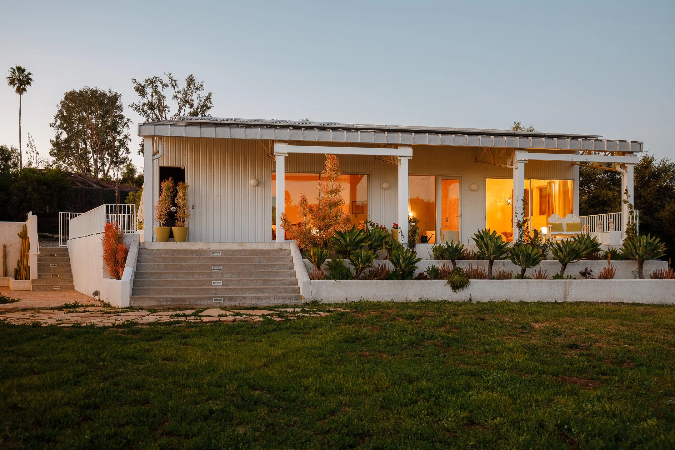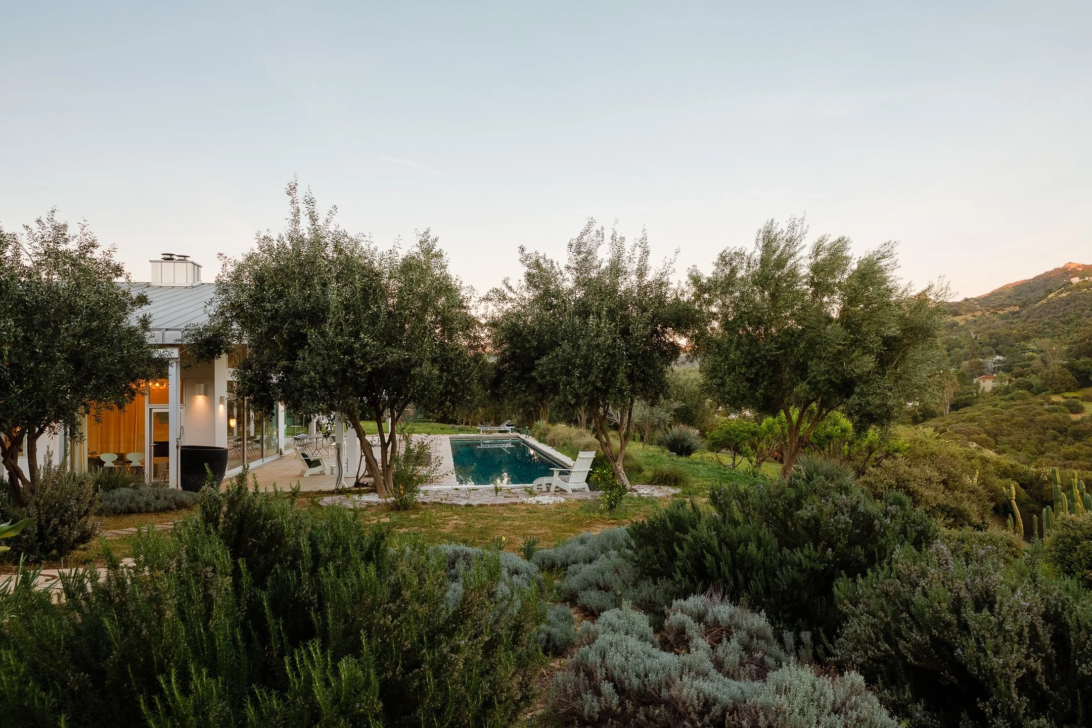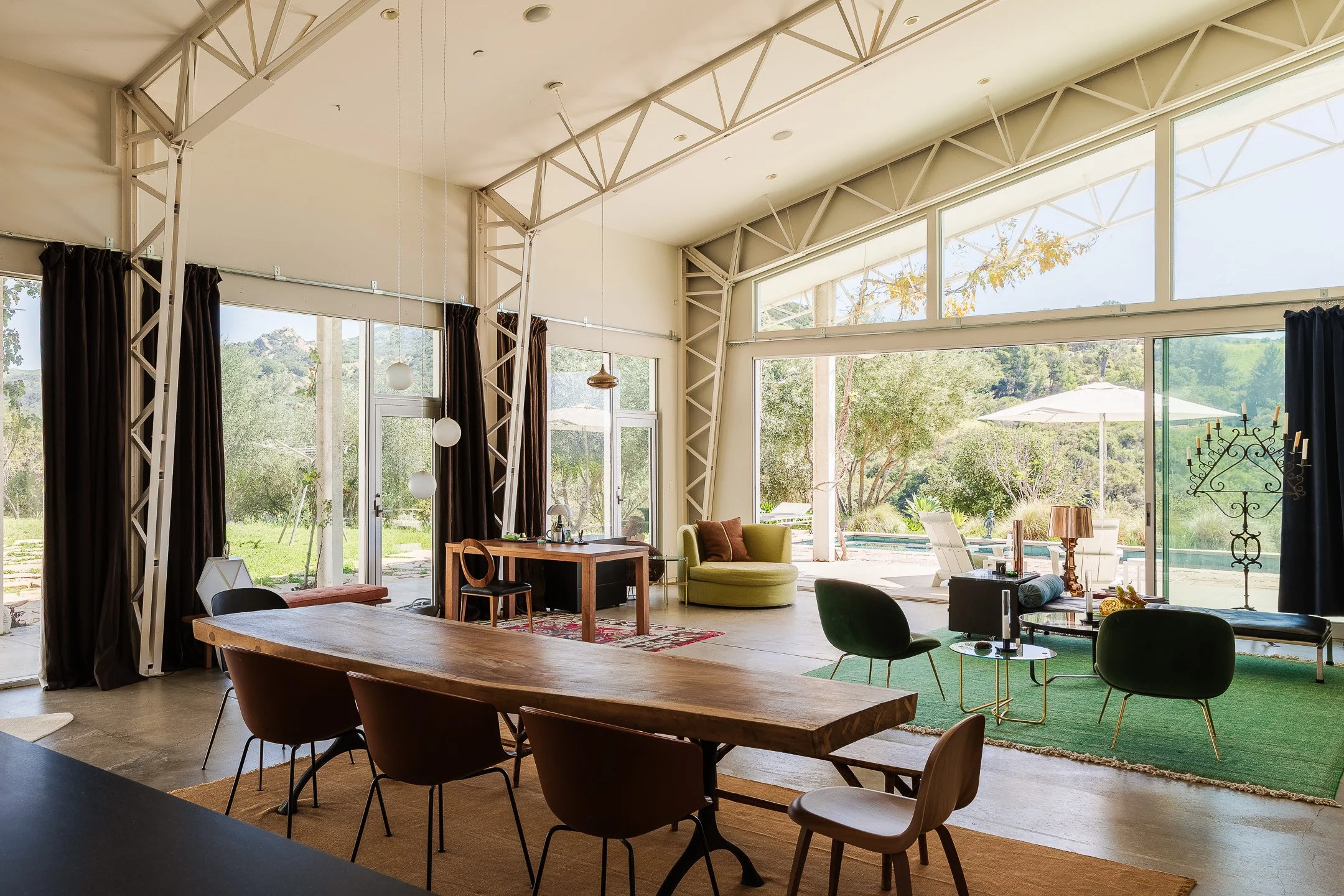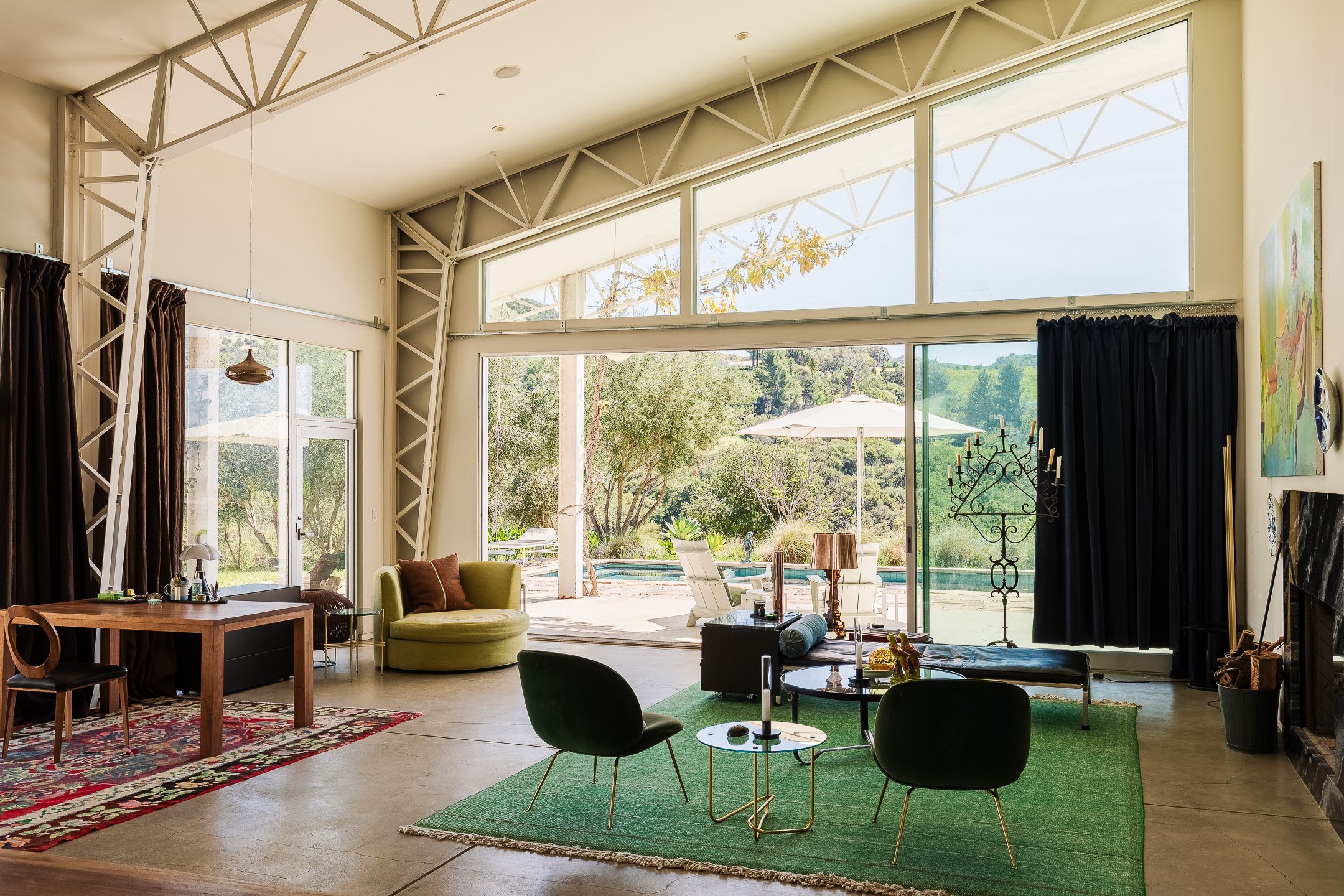 At the top of the hill, on an extraordinary 60,000 sqft site with panoramic views of the canyon and rolling hills, sits this architectural estate designed in 2007 by Barbara Bestor. Two buildings are positioned side by side, forming an entrance promenade and an open patio between them. The main house, spanning 3,951 sqft, features expansive double-height spaces and an open floor plan. It is only partially divided by a series of walls that define the primary bedroom and bathroom, as well as a loft with several office/bedroom spaces and an additional guest suite with its own kitchen. All rooms on the main level have direct access to the outdoors with private garden areas. The main living area, including the kitchen and dining, shares a double fireplace with the adjacent primary bedroom. Both face a pool that runs the length of the house and overlooks the canyon. A 12-foot-deep shaded porch creates a transitional space between indoors and outdoors, ideal for lounging and embracing a daytime outdoor lifestyle. The guesthouse, or "Moon Suite" (679 sq ft), is a fully independent unit with a bedroom, bathroom, kitchen area, and living room - all oriented towards the view. At the rear of the structure, there is also a large studio with storage space that could be used as a 3-4 car garage. The owners' desire for a sustainable home led to the use of structural steel trusses and a custom-adapted prefabricated system, allowing for wide spans and open spaces. Passive temperature control supports year-round heating and cooling (now supplemented by additional AC units), while large custom windows are coated with a low-emissivity transparent metallic film. The white metal facade reflects light, reducing heat gain. The house features very high ceilings inspired by vernacular agrarian shed structures and includes solar panels, radiant heating, and a variety of peach, pear, and olive trees on the property. This special compound, offering multiple possibilities for an artist/wellness retreat, is on the market for the first time and represents one of the few sustainable designs by Barbara Bestor ever available for sale.