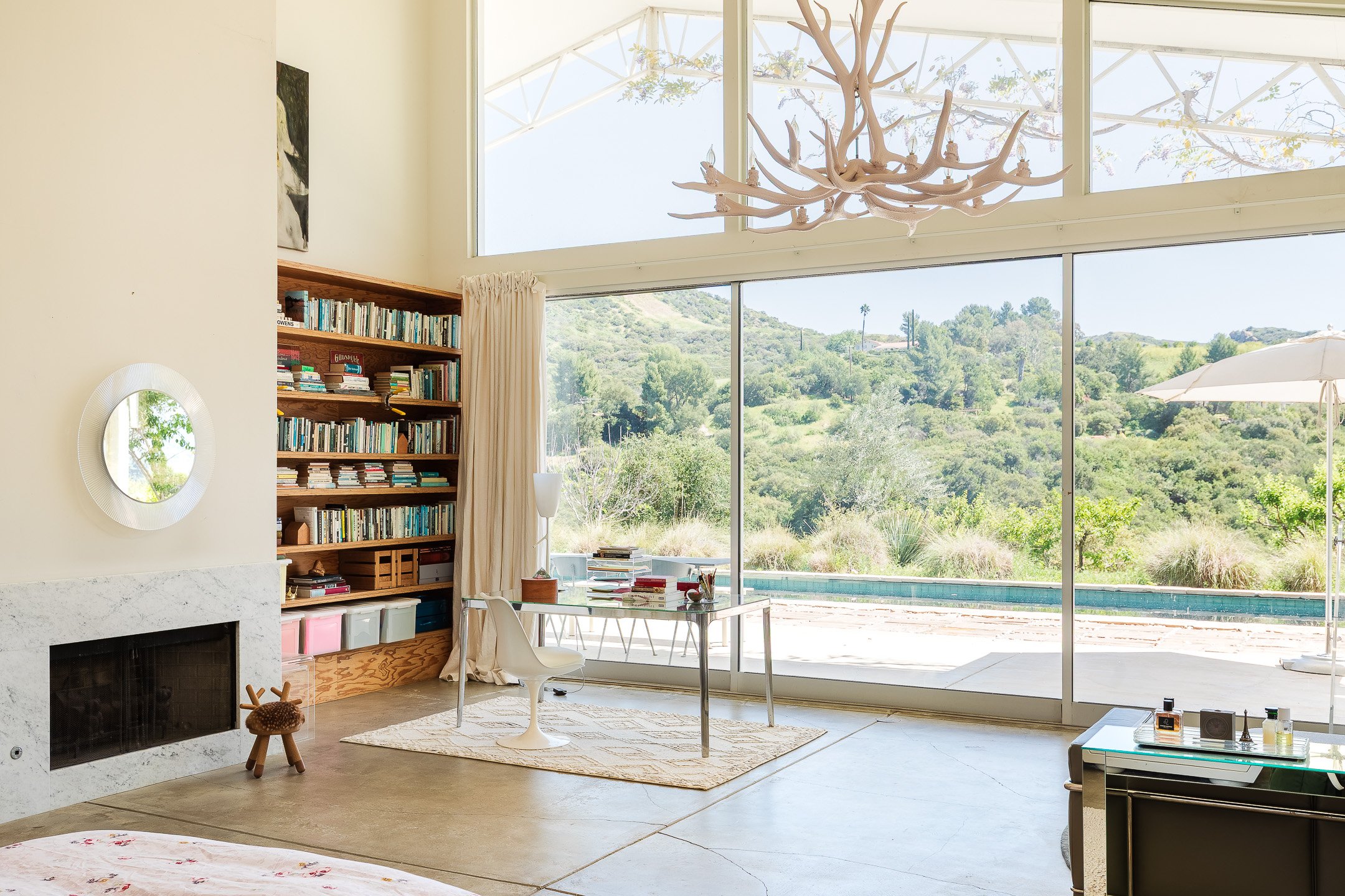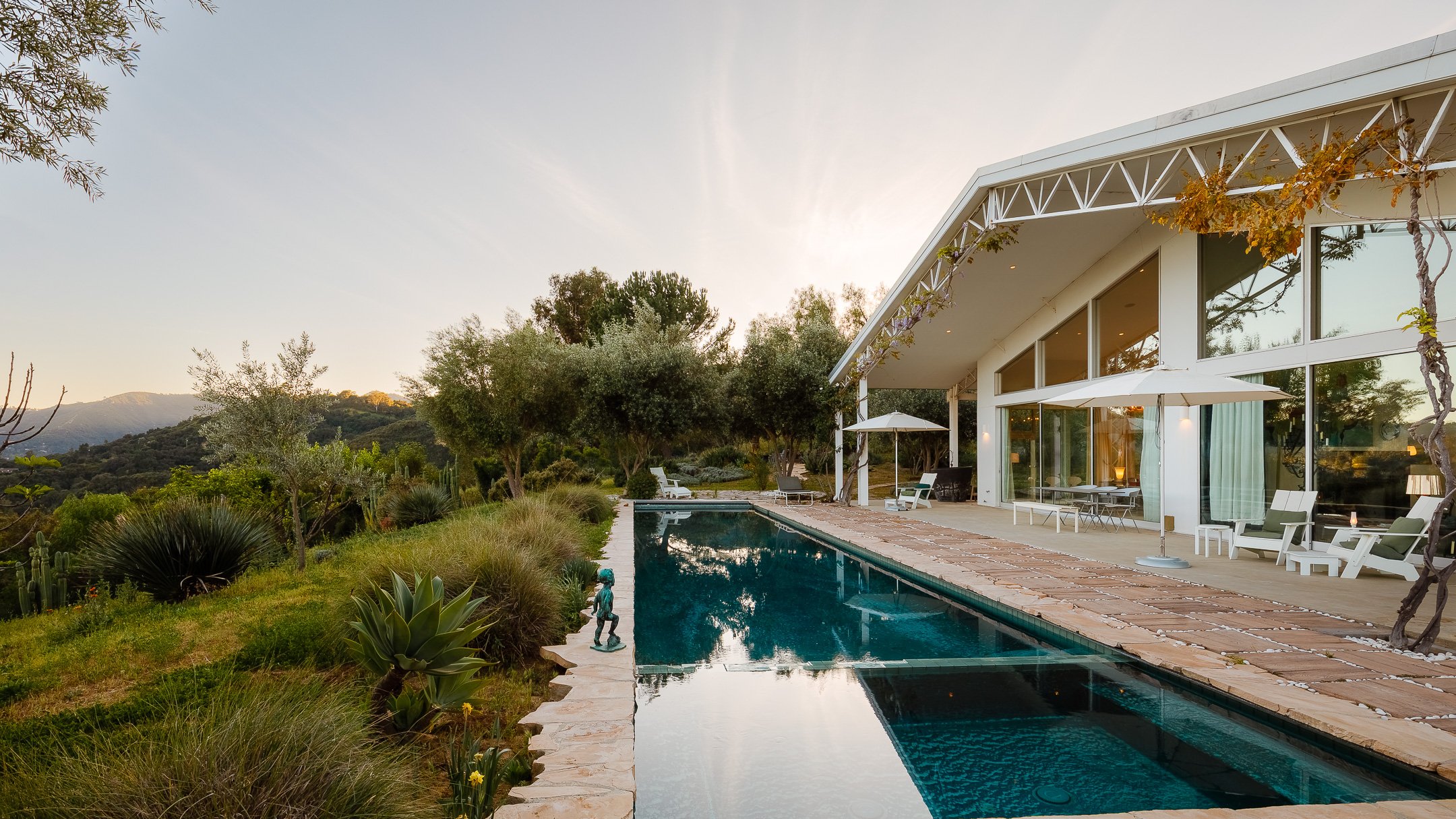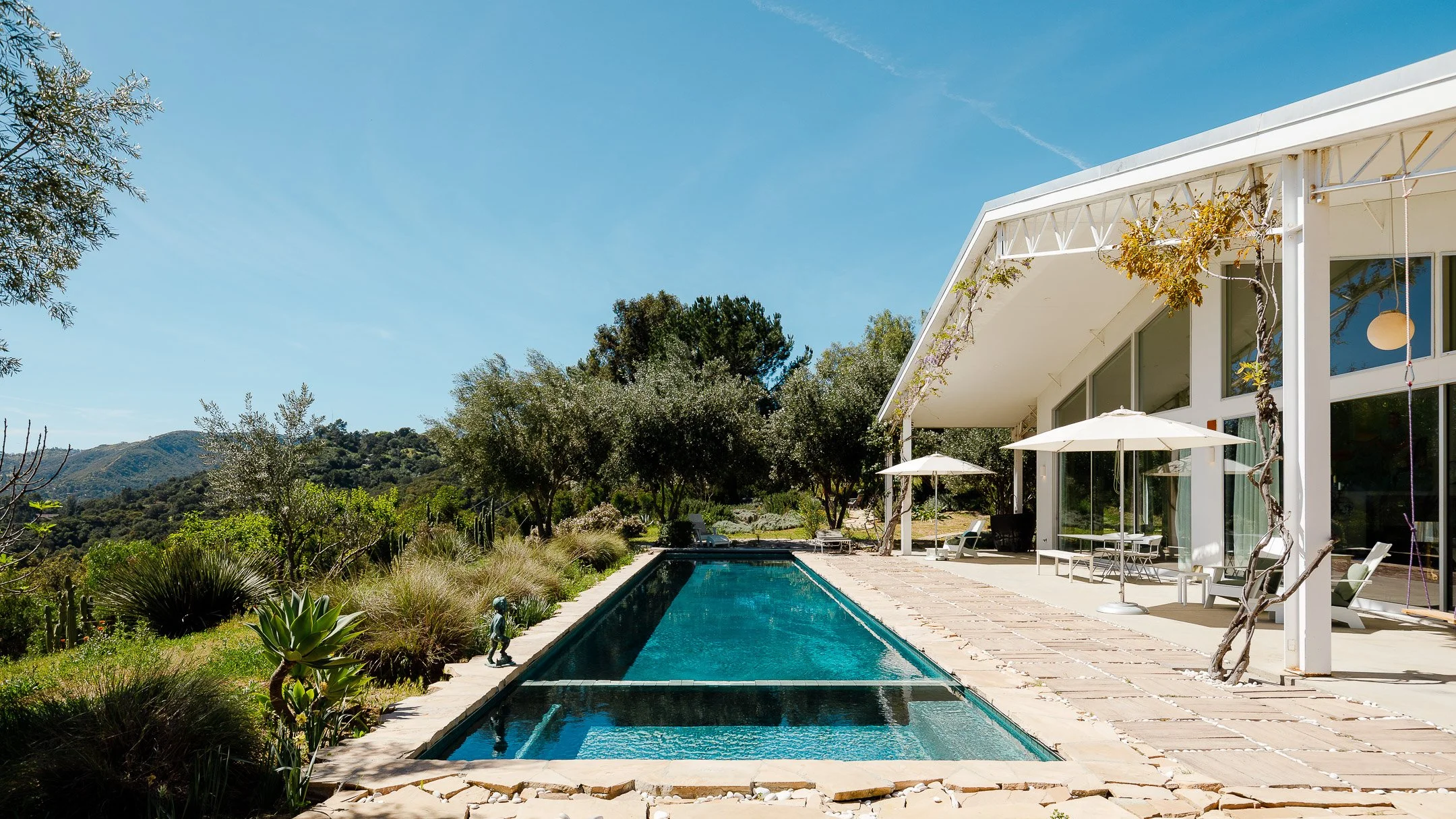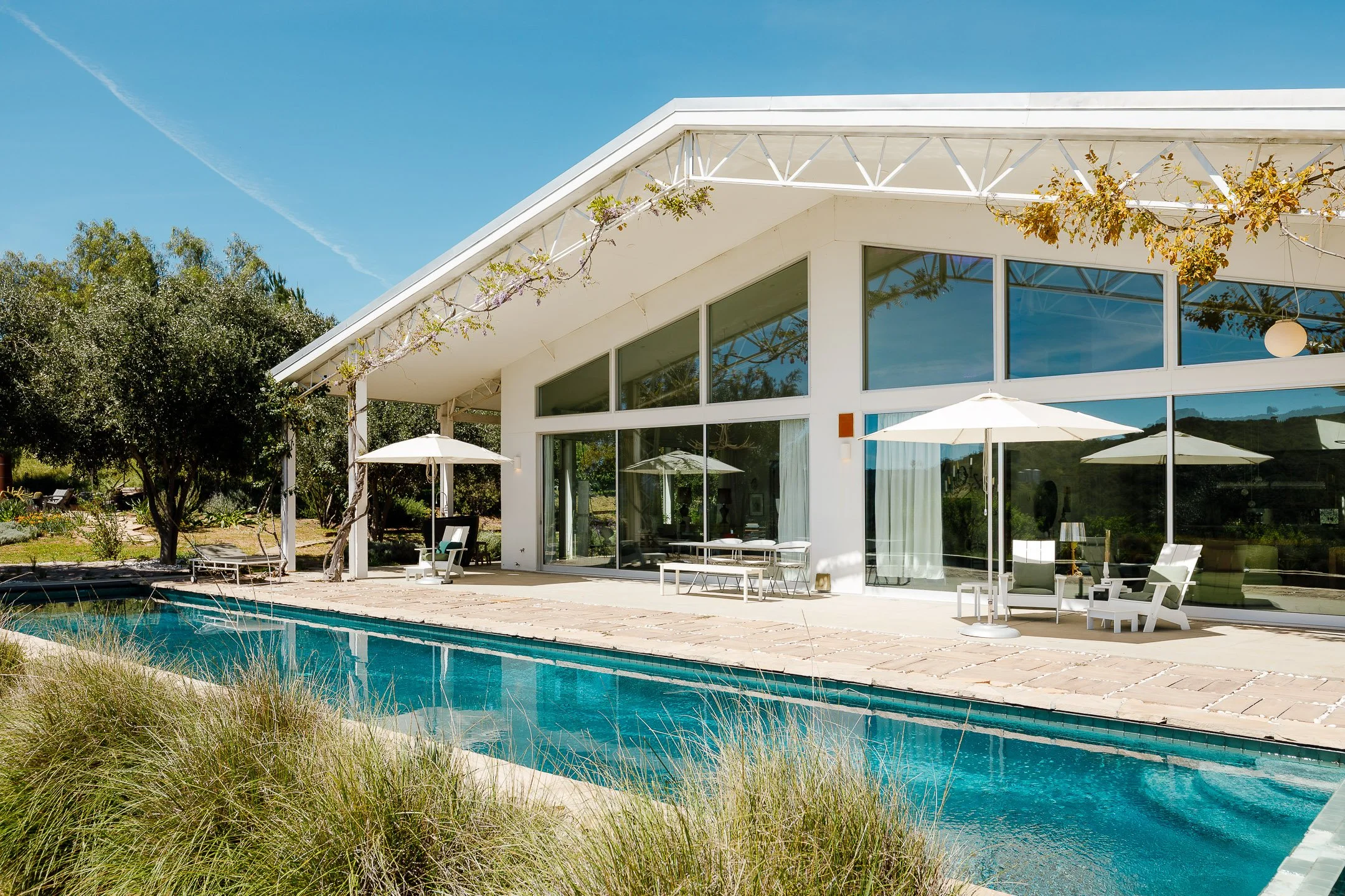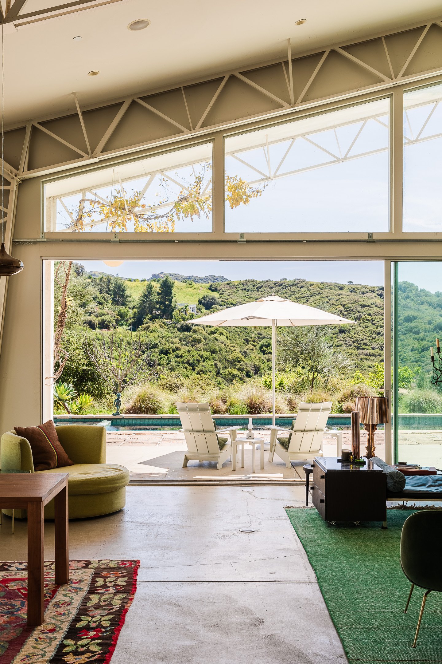 At the top of the hill, on an extraordinary 60,000 sqft site with panoramic views of the canyon and rolling hills, sits this architectural estate designed in 2007 by Barbara Bestor. Two buildings are positioned side by side, forming an entrance promenade and an open patio between them. The main house, spanning 3,951 sqft, features expansive double-height spaces and an open floor plan. It is only partially divided by a series of walls that define the primary bedroom and bathroom, as well as a loft with several office/bedroom spaces and an additional guest suite with its own kitchen. All rooms on the main level have direct access to the outdoors with private garden areas. The main living area, including the kitchen and dining, shares a double fireplace with the adjacent primary bedroom. Both face a pool that runs the length of the house and overlooks the canyon. A 12-foot-deep shaded porch creates a transitional space between indoors and outdoors, ideal for lounging and embracing a daytime outdoor lifestyle. The guesthouse, or "Moon Suite" (679 sq ft), is a fully independent unit with a bedroom, bathroom, kitchen area, and living room - all oriented towards the view. At the rear of the structure, there is also a large studio with storage space that could be used as a 3-4 car garage. The owners' desire for a sustainable home led to the use of structural steel trusses and a custom-adapted prefabricated system, allowing for wide spans and open spaces. Passive temperature control supports year-round heating and cooling (now supplemented by additional AC units), while large custom windows are coated with a low-emissivity transparent metallic film. The white metal facade reflects light, reducing heat gain. The house features very high ceilings inspired by vernacular agrarian shed structures and includes solar panels, radiant heating, and a variety of peach, pear, and olive trees on the property. This special compound, offering multiple possibilities for an artist/wellness retreat, is on the market for the first time and represents one of the few sustainable designs by Barbara Bestor ever available for sale.