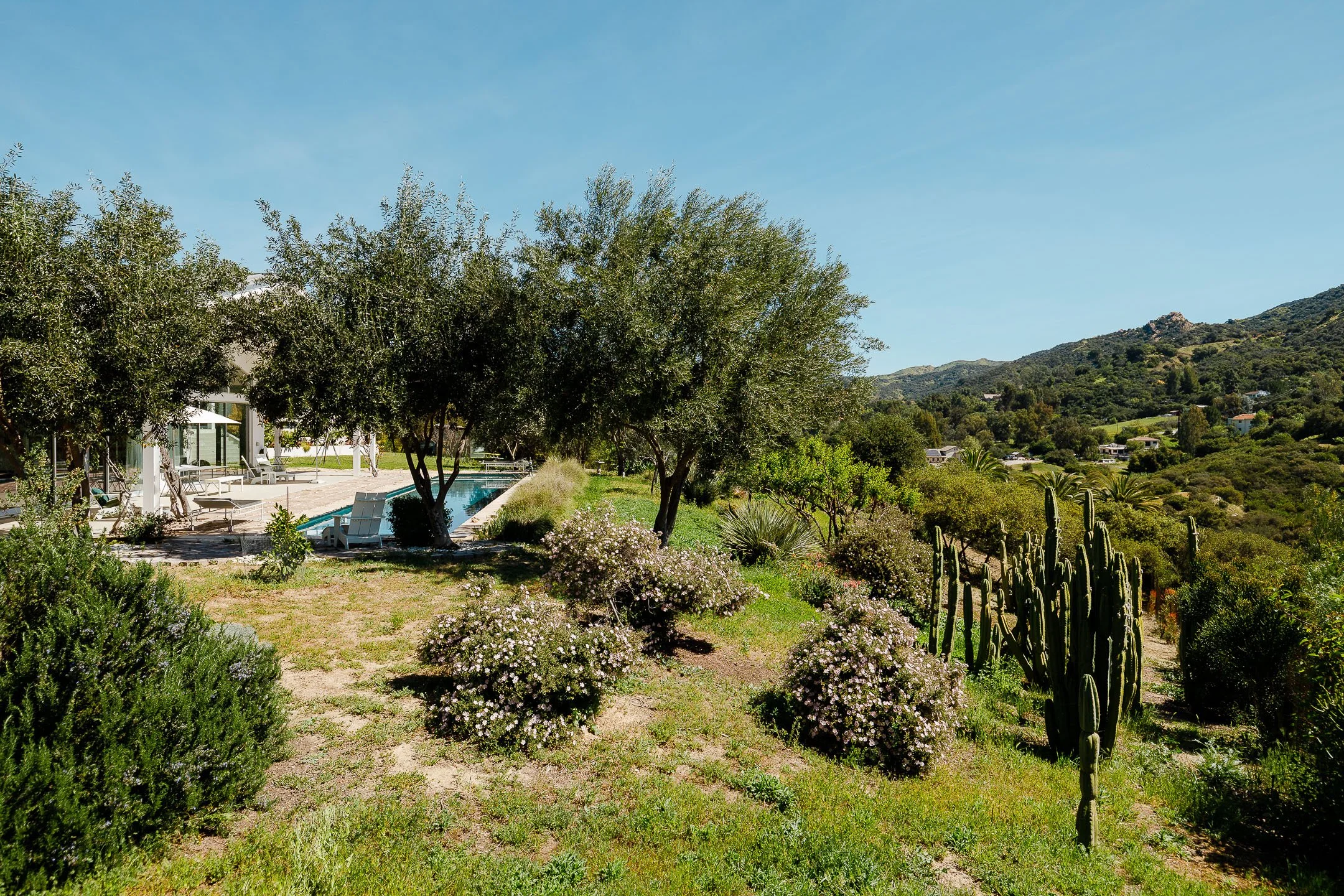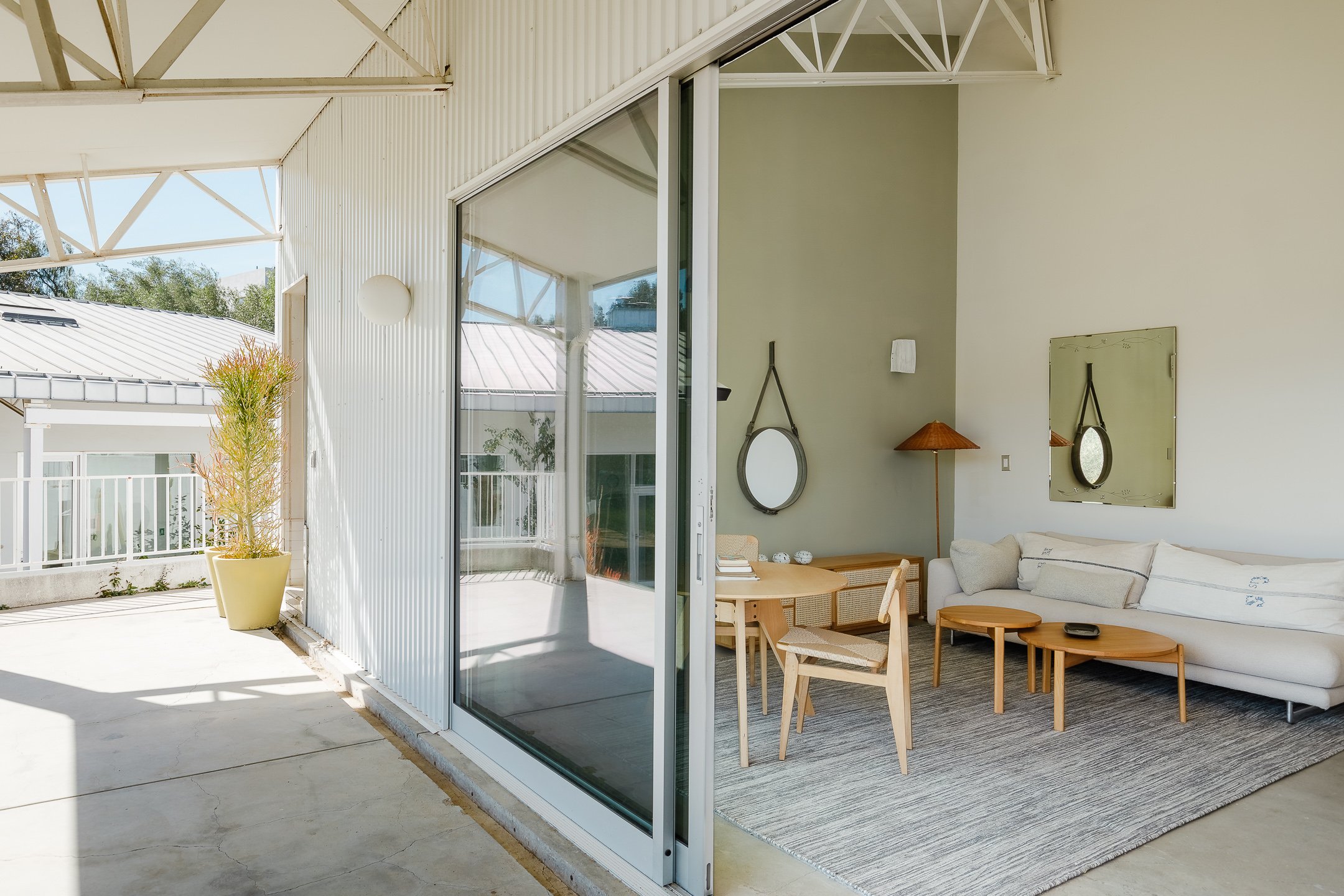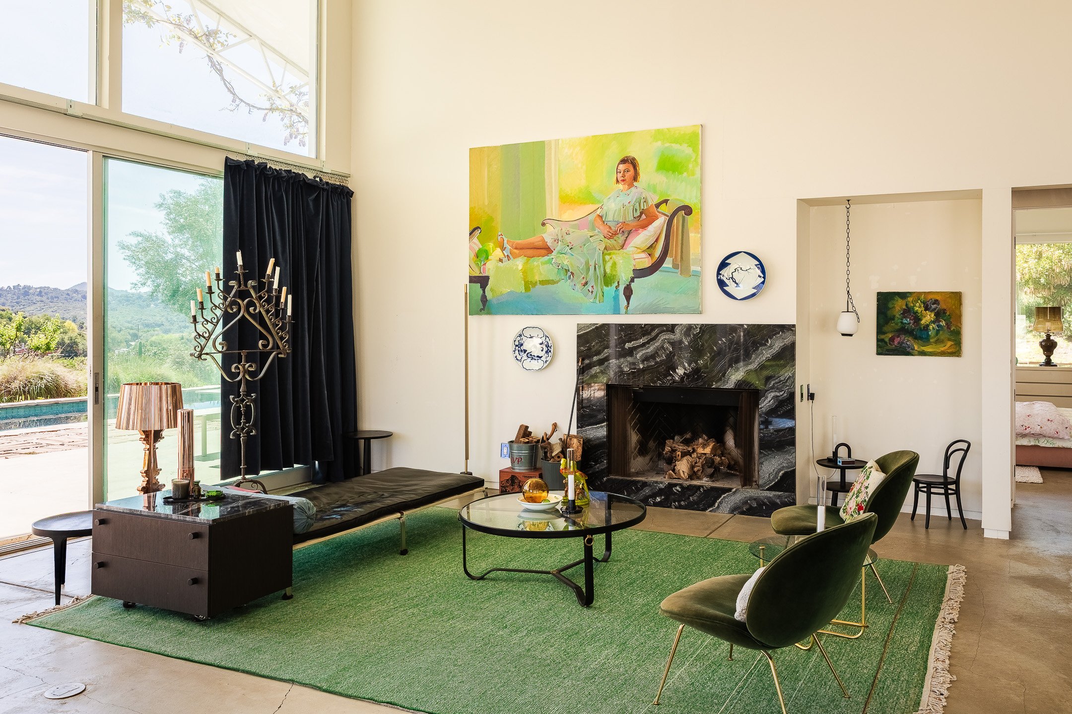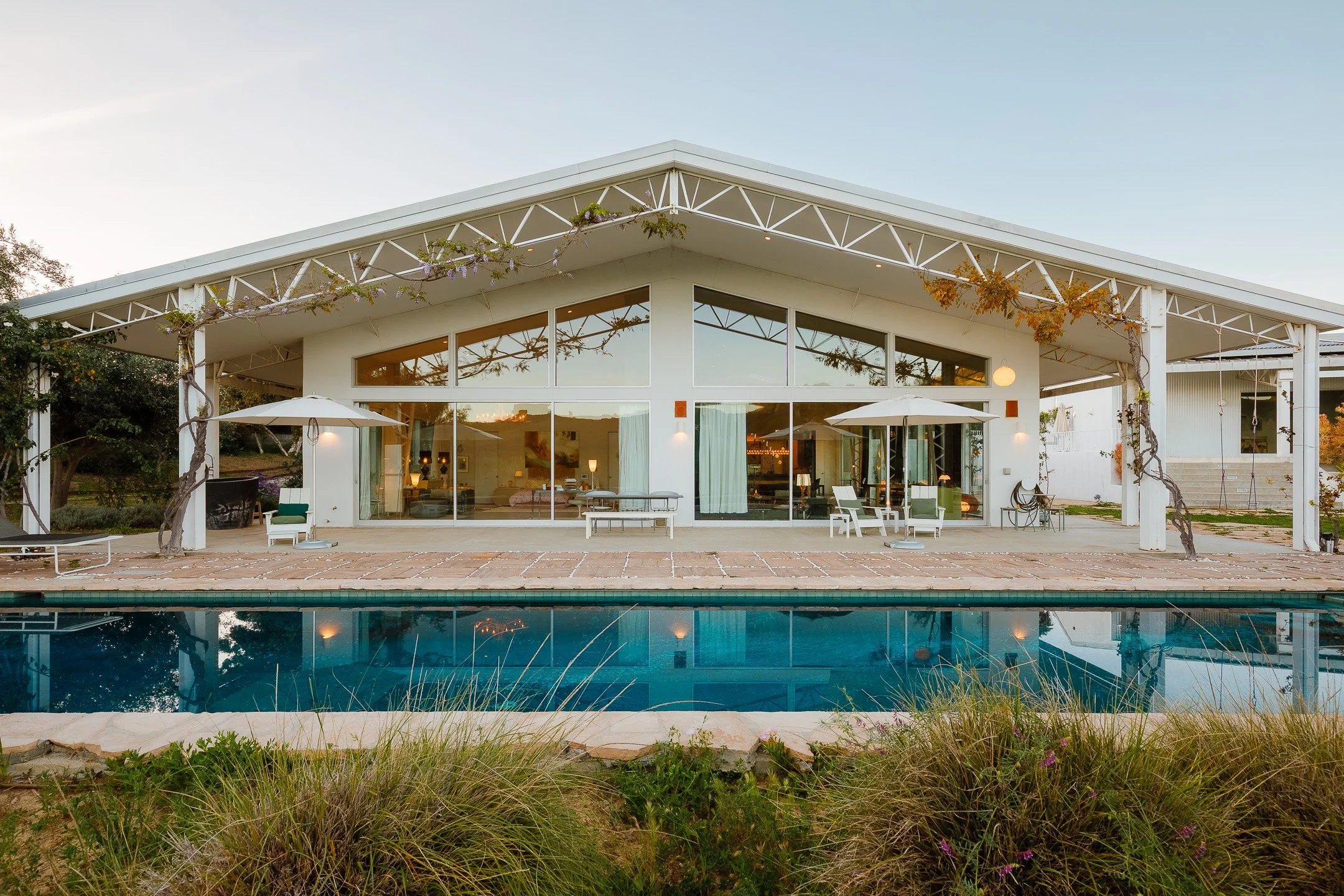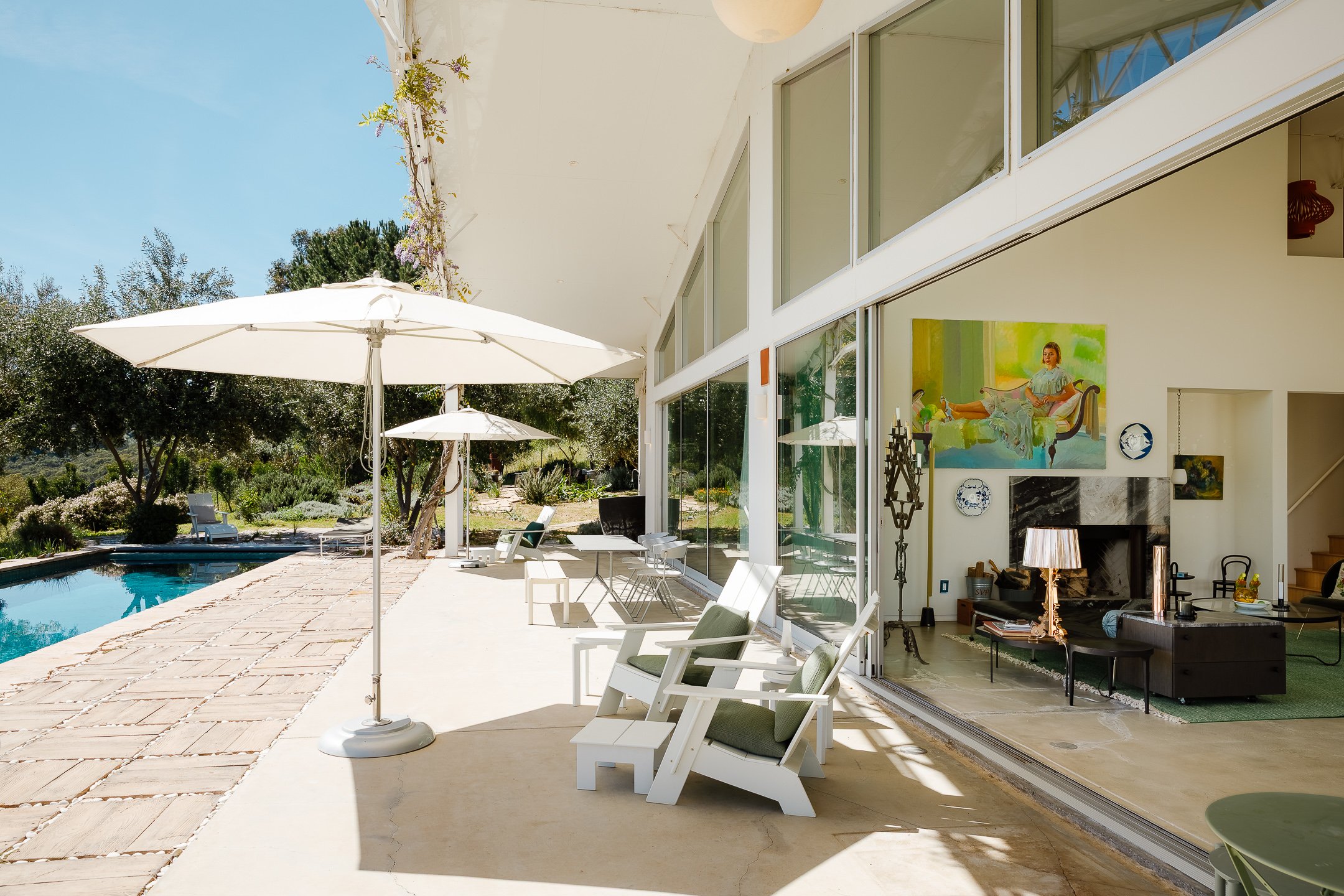 At the top of the hill, on an extraordinary 60,000 sqft site with panoramic views of the canyon and rolling hills, sits this architectural estate designed in 2007 by Barbara Bestor. Two buildings are positioned side by side, forming an entrance promenade and an open patio between them. The main house, spanning 3,951 sqft, features expansive double-height spaces and an open floor plan. It is only partially divided by a series of walls that define the primary bedroom and bathroom, as well as a loft with several office/bedroom spaces and an additional guest suite with its own kitchen. All rooms on the main level have direct access to the outdoors with private garden areas. The main living area, including the kitchen and dining, shares a double fireplace with the adjacent primary bedroom. Both face a pool that runs the length of the house and overlooks the canyon. A 12-foot-deep shaded porch creates a transitional space between indoors and outdoors, ideal for lounging and embracing a daytime outdoor lifestyle. The guesthouse, or "Moon Suite" (679 sq ft), is a fully independent unit with a bedroom, bathroom, kitchen area, and living room - all oriented towards the view. At the rear of the structure, there is also a large studio with storage space that could be used as a 3-4 car garage. The owners' desire for a sustainable home led to the use of structural steel trusses and a custom-adapted prefabricated system, allowing for wide spans and open spaces. Passive temperature control supports year-round heating and cooling (now supplemented by additional AC units), while large custom windows are coated with a low-emissivity transparent metallic film. The white metal facade reflects light, reducing heat gain. The house features very high ceilings inspired by vernacular agrarian shed structures and includes solar panels, radiant heating, and a variety of peach, pear, and olive trees on the property. This special compound, offering multiple possibilities for an artist/wellness retreat, is on the market for the first time and represents one of the few sustainable designs by Barbara Bestor ever available for sale.