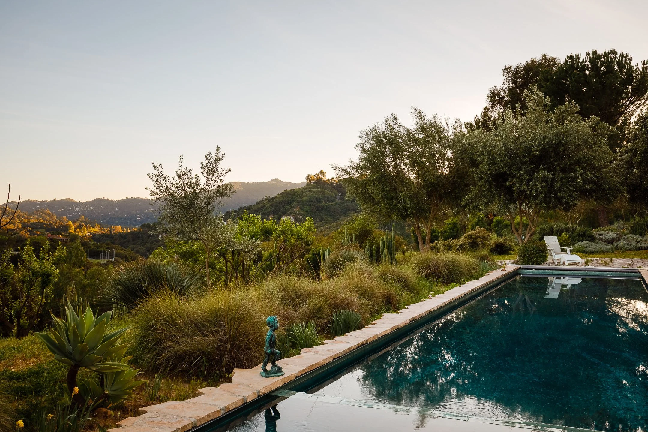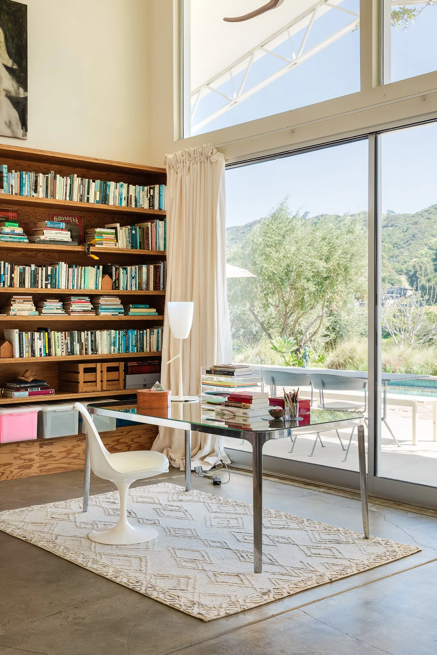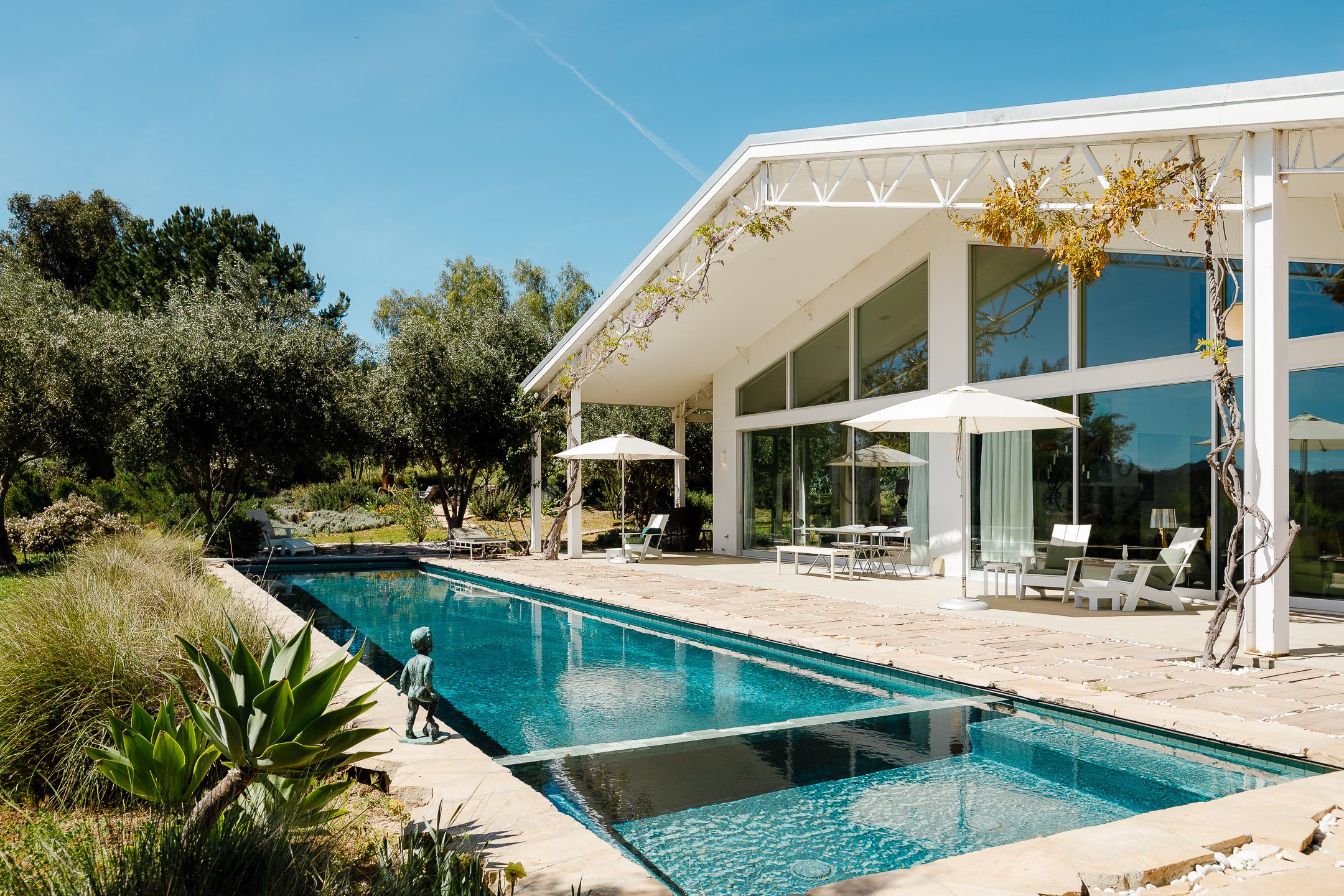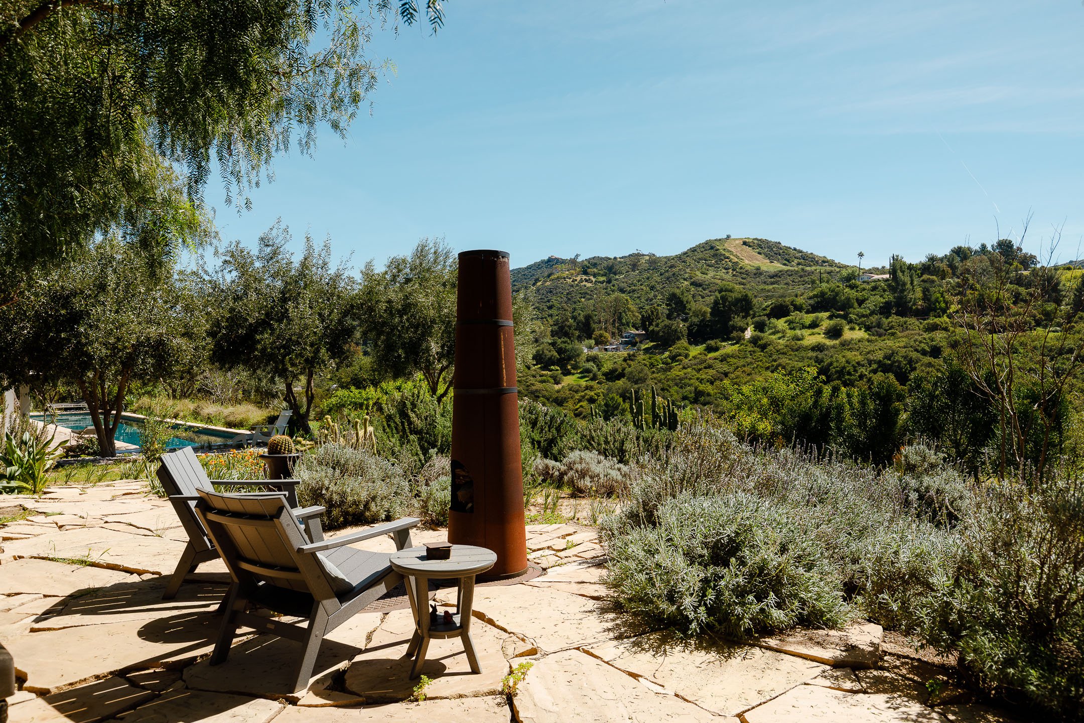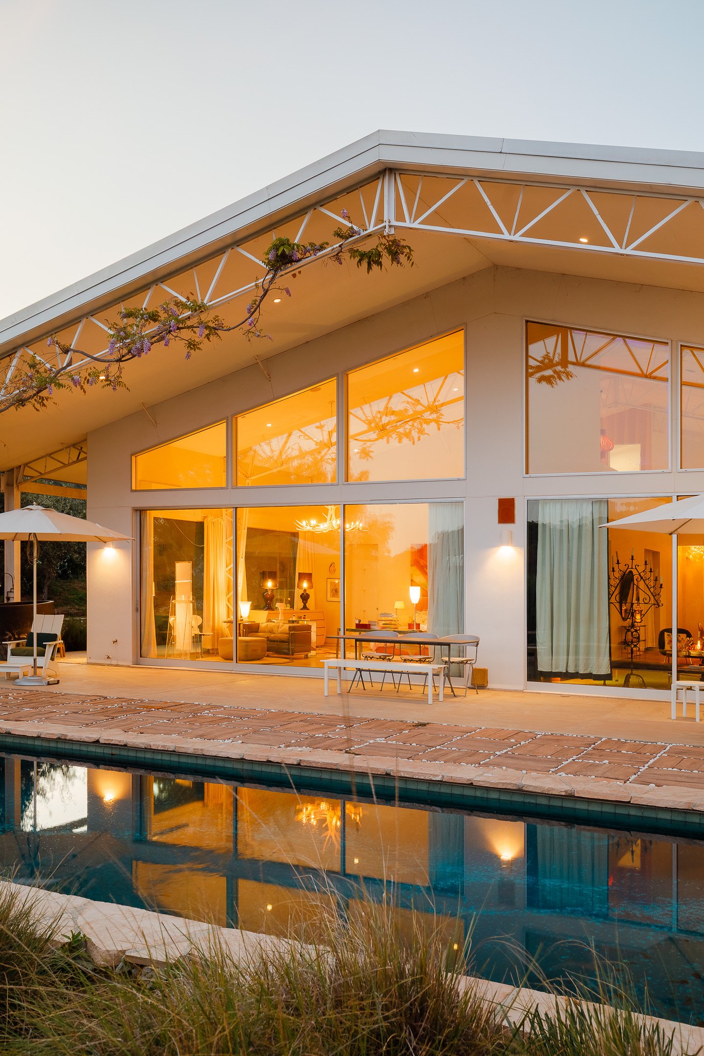 At the top of the hill, on an extraordinary 60,000 sqft site with panoramic views of the canyon and rolling hills, sits this architectural estate designed in 2007 by Barbara Bestor. Two buildings are positioned side by side, forming an entrance promenade and an open patio between them. The main house, spanning 3,951 sqft, features expansive double-height spaces and an open floor plan. It is only partially divided by a series of walls that define the primary bedroom and bathroom, as well as a loft with several office/bedroom spaces and an additional guest suite with its own kitchen. All rooms on the main level have direct access to the outdoors with private garden areas. The main living area, including the kitchen and dining, shares a double fireplace with the adjacent primary bedroom. Both face a pool that runs the length of the house and overlooks the canyon. A 12-foot-deep shaded porch creates a transitional space between indoors and outdoors, ideal for lounging and embracing a daytime outdoor lifestyle. The guesthouse, or "Moon Suite" (679 sq ft), is a fully independent unit with a bedroom, bathroom, kitchen area, and living room - all oriented towards the view. At the rear of the structure, there is also a large studio with storage space that could be used as a 3-4 car garage. The owners' desire for a sustainable home led to the use of structural steel trusses and a custom-adapted prefabricated system, allowing for wide spans and open spaces. Passive temperature control supports year-round heating and cooling (now supplemented by additional AC units), while large custom windows are coated with a low-emissivity transparent metallic film. The white metal facade reflects light, reducing heat gain. The house features very high ceilings inspired by vernacular agrarian shed structures and includes solar panels, radiant heating, and a variety of peach, pear, and olive trees on the property. This special compound, offering multiple possibilities for an artist/wellness retreat, is on the market for the first time and represents one of the few sustainable designs by Barbara Bestor ever available for sale.