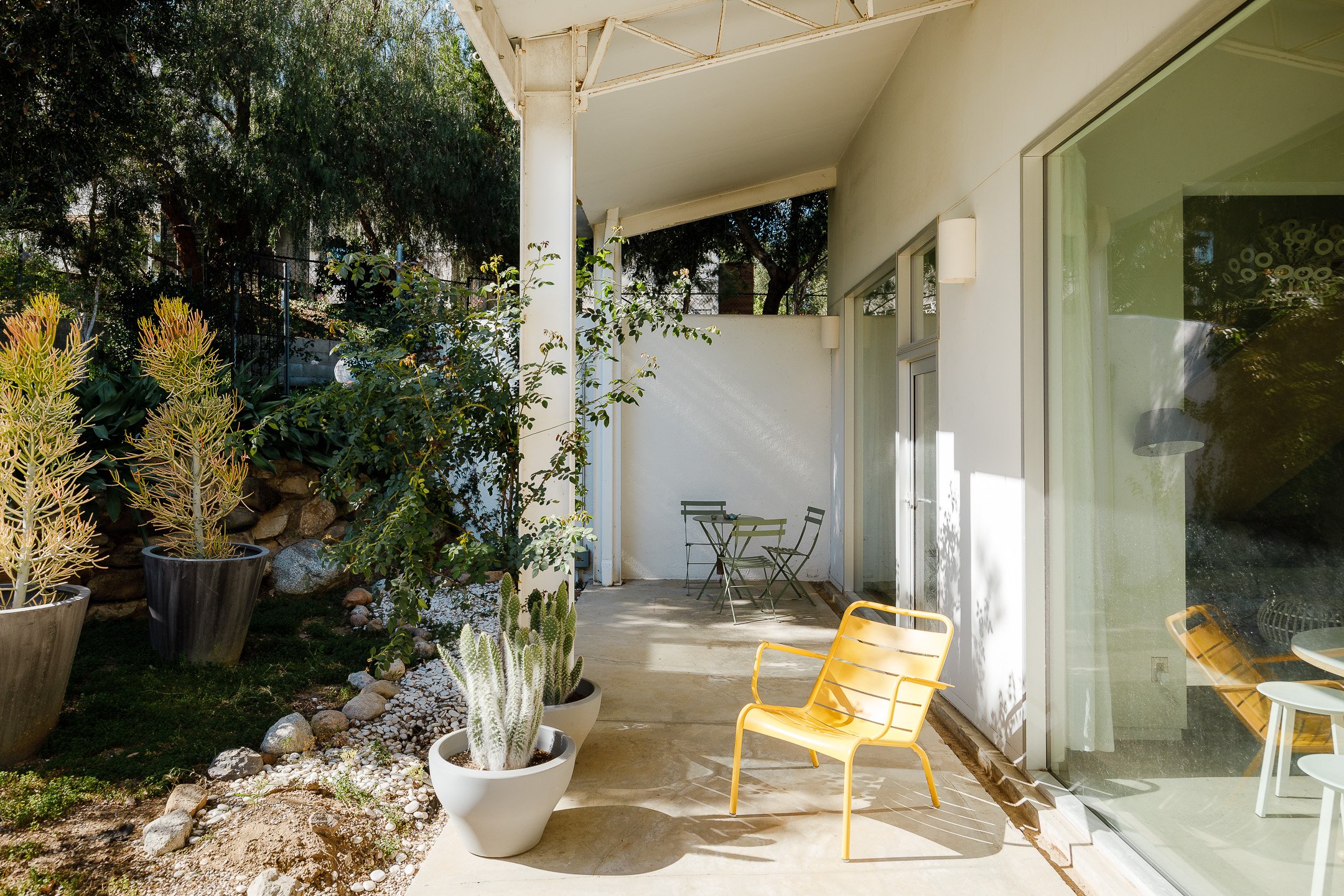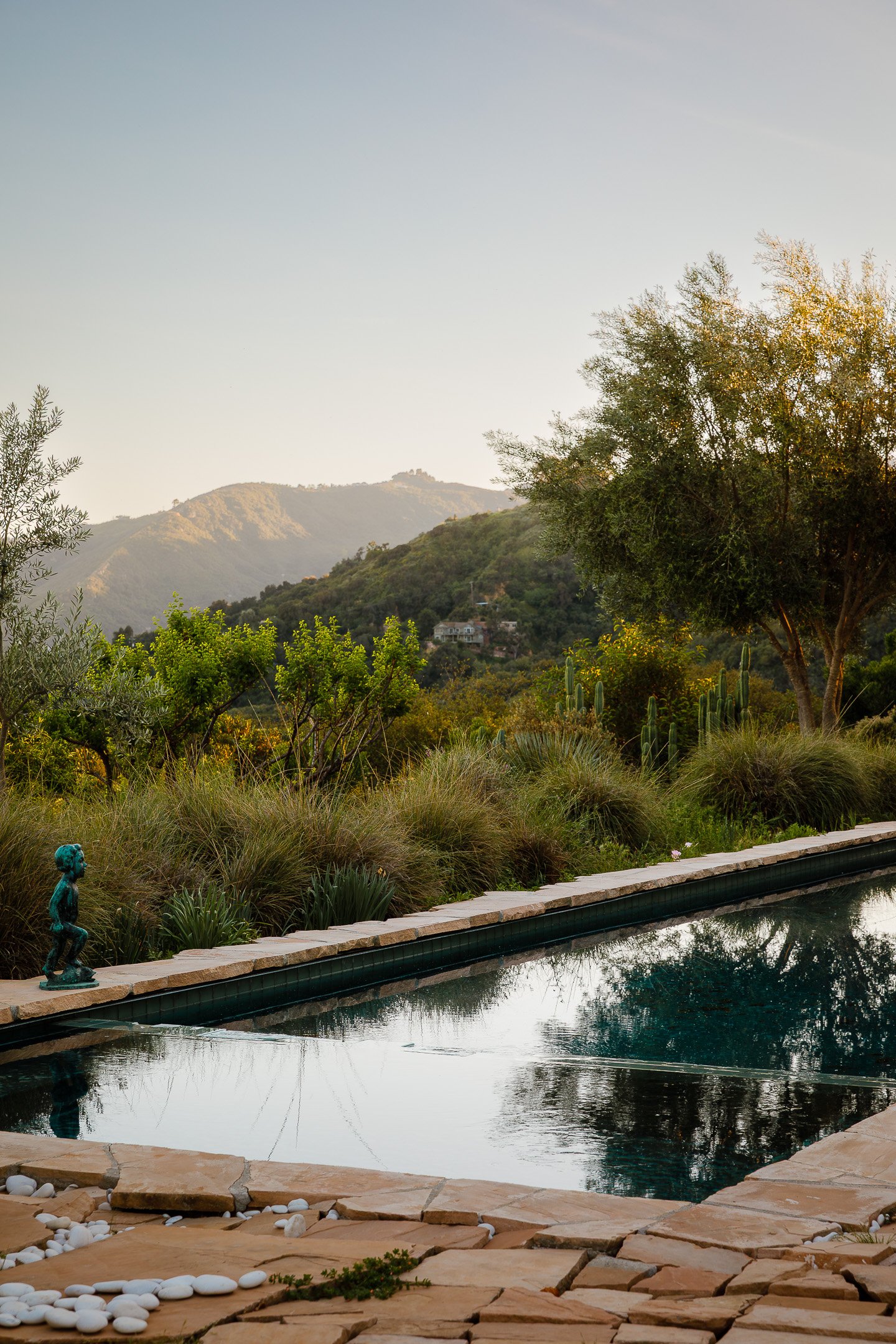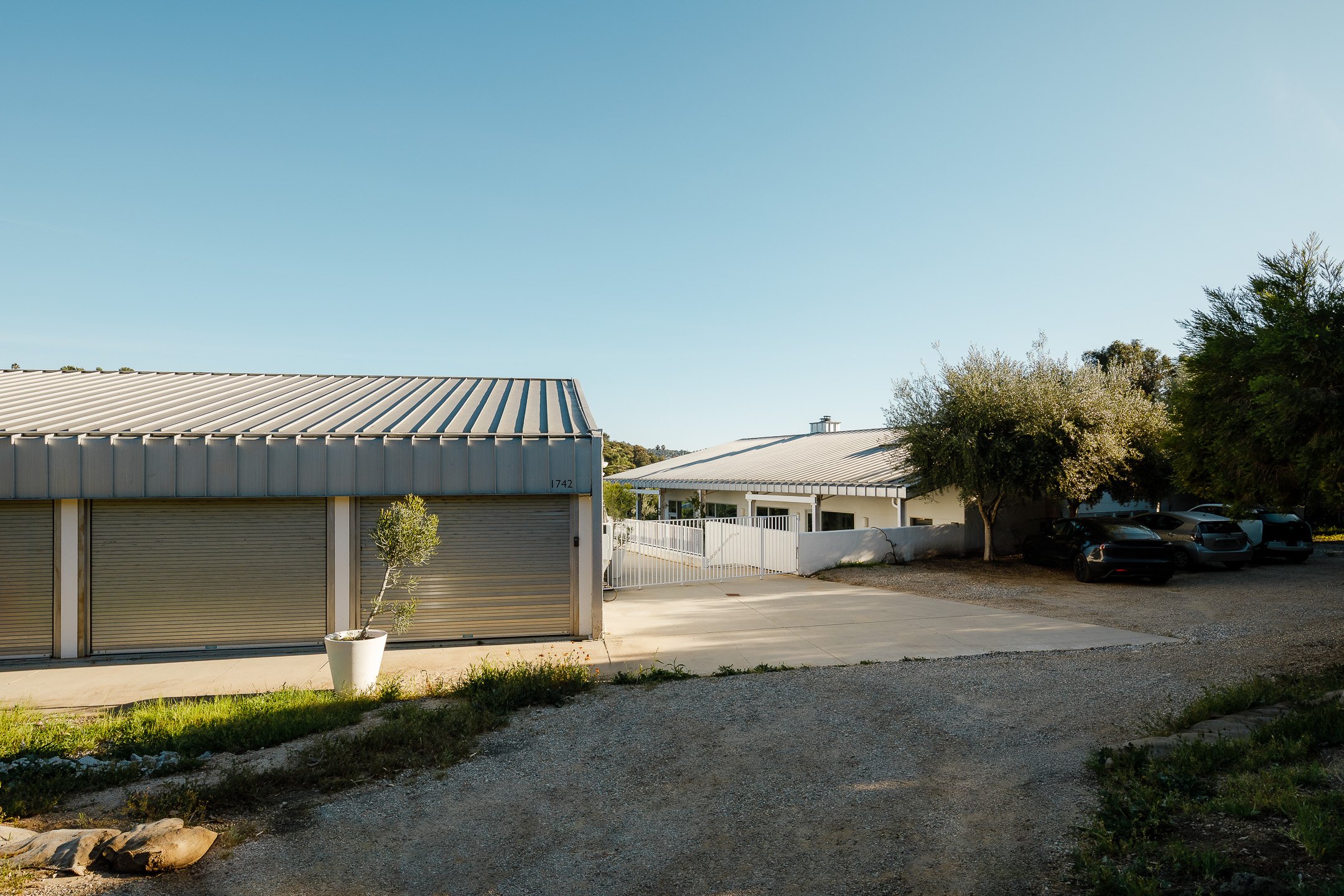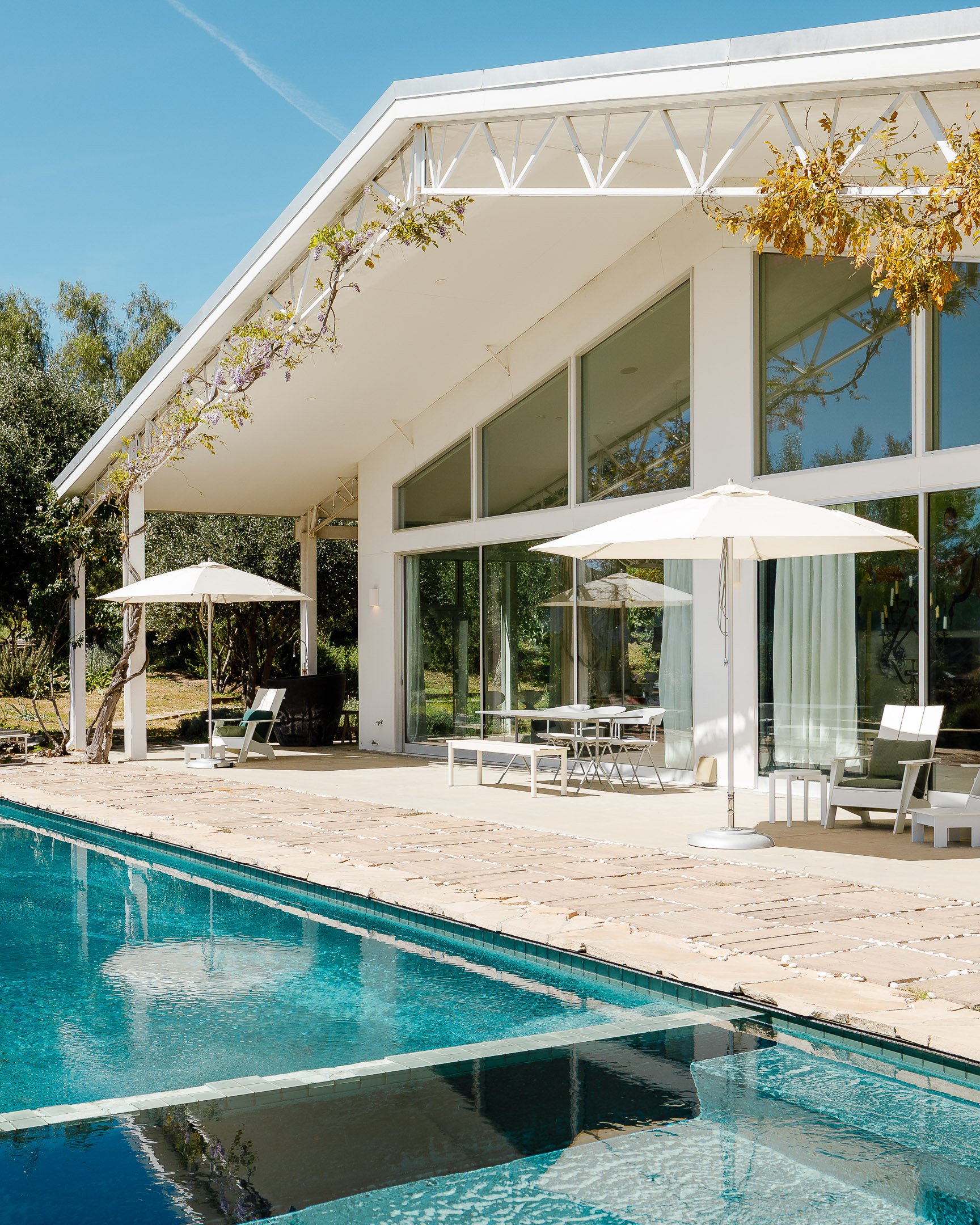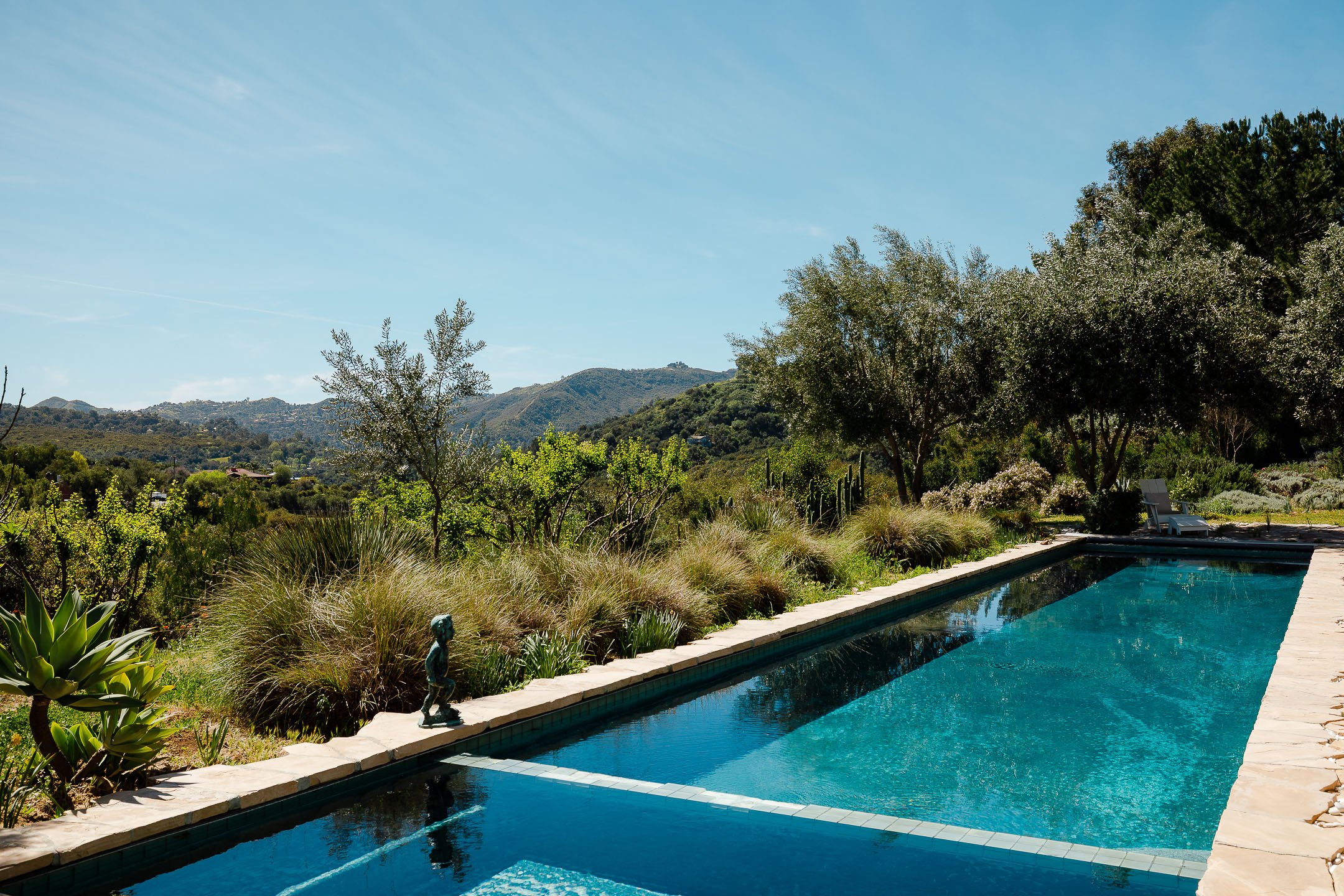 At the top of the hill, on an extraordinary 60,000 sqft site with panoramic views of the canyon and rolling hills, sits this architectural estate designed in 2007 by Barbara Bestor. Two buildings are positioned side by side, forming an entrance promenade and an open patio between them. The main house, spanning 3,951 sqft, features expansive double-height spaces and an open floor plan. It is only partially divided by a series of walls that define the primary bedroom and bathroom, as well as a loft with several office/bedroom spaces and an additional guest suite with its own kitchen. All rooms on the main level have direct access to the outdoors with private garden areas. The main living area, including the kitchen and dining, shares a double fireplace with the adjacent primary bedroom. Both face a pool that runs the length of the house and overlooks the canyon. A 12-foot-deep shaded porch creates a transitional space between indoors and outdoors, ideal for lounging and embracing a daytime outdoor lifestyle. The guesthouse, or "Moon Suite" (679 sq ft), is a fully independent unit with a bedroom, bathroom, kitchen area, and living room - all oriented towards the view. At the rear of the structure, there is also a large studio with storage space that could be used as a 3-4 car garage. The owners' desire for a sustainable home led to the use of structural steel trusses and a custom-adapted prefabricated system, allowing for wide spans and open spaces. Passive temperature control supports year-round heating and cooling (now supplemented by additional AC units), while large custom windows are coated with a low-emissivity transparent metallic film. The white metal facade reflects light, reducing heat gain. The house features very high ceilings inspired by vernacular agrarian shed structures and includes solar panels, radiant heating, and a variety of peach, pear, and olive trees on the property. This special compound, offering multiple possibilities for an artist/wellness retreat, is on the market for the first time and represents one of the few sustainable designs by Barbara Bestor ever available for sale.