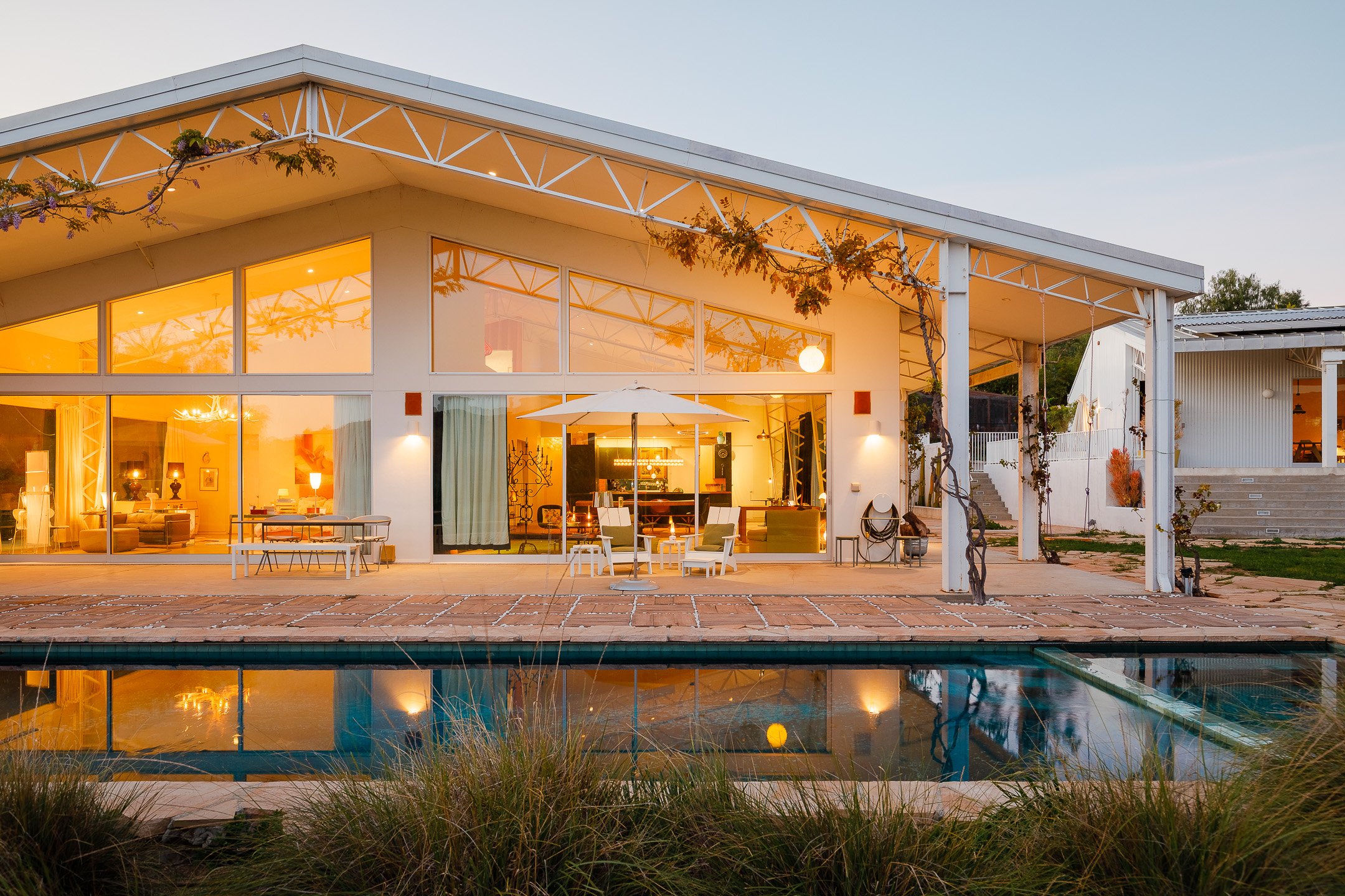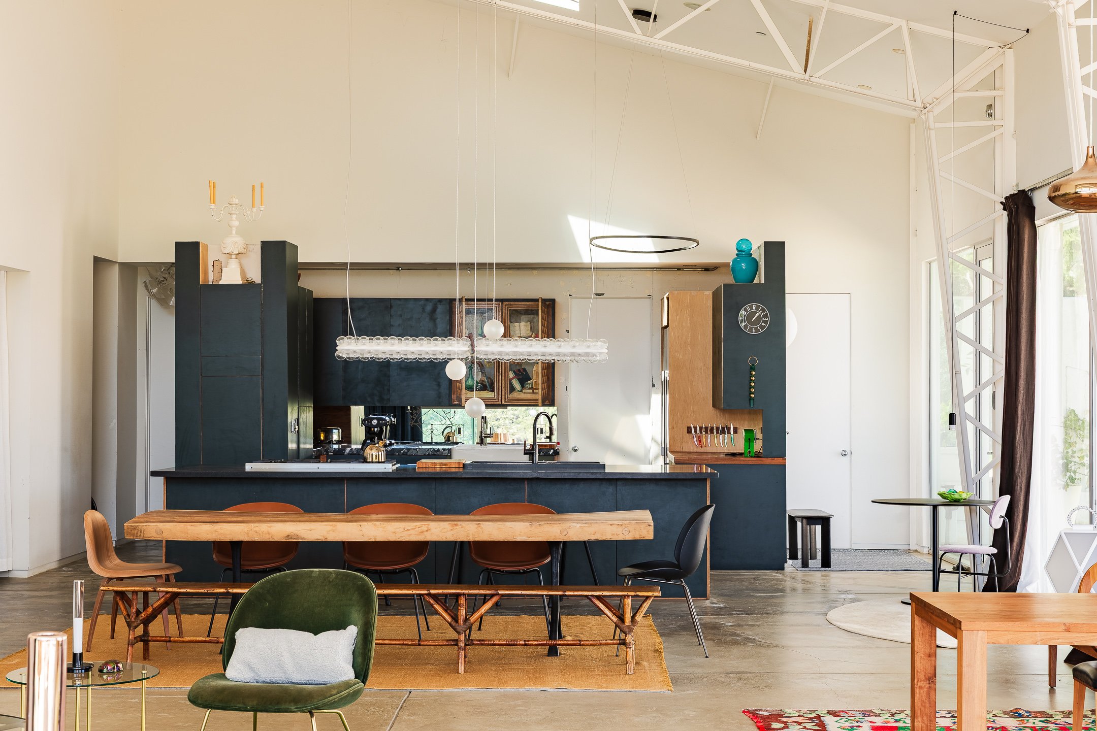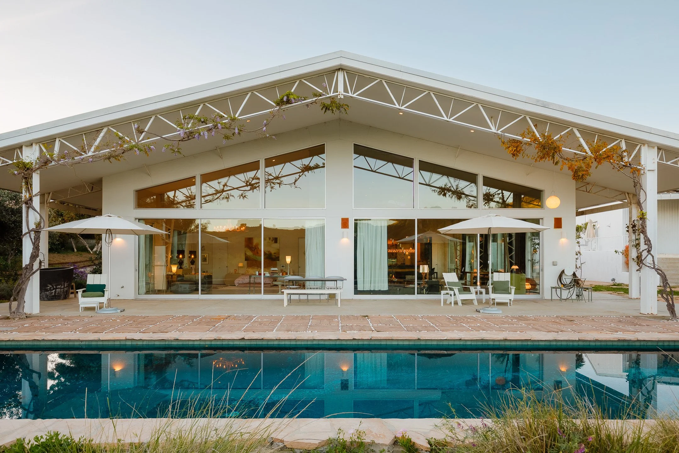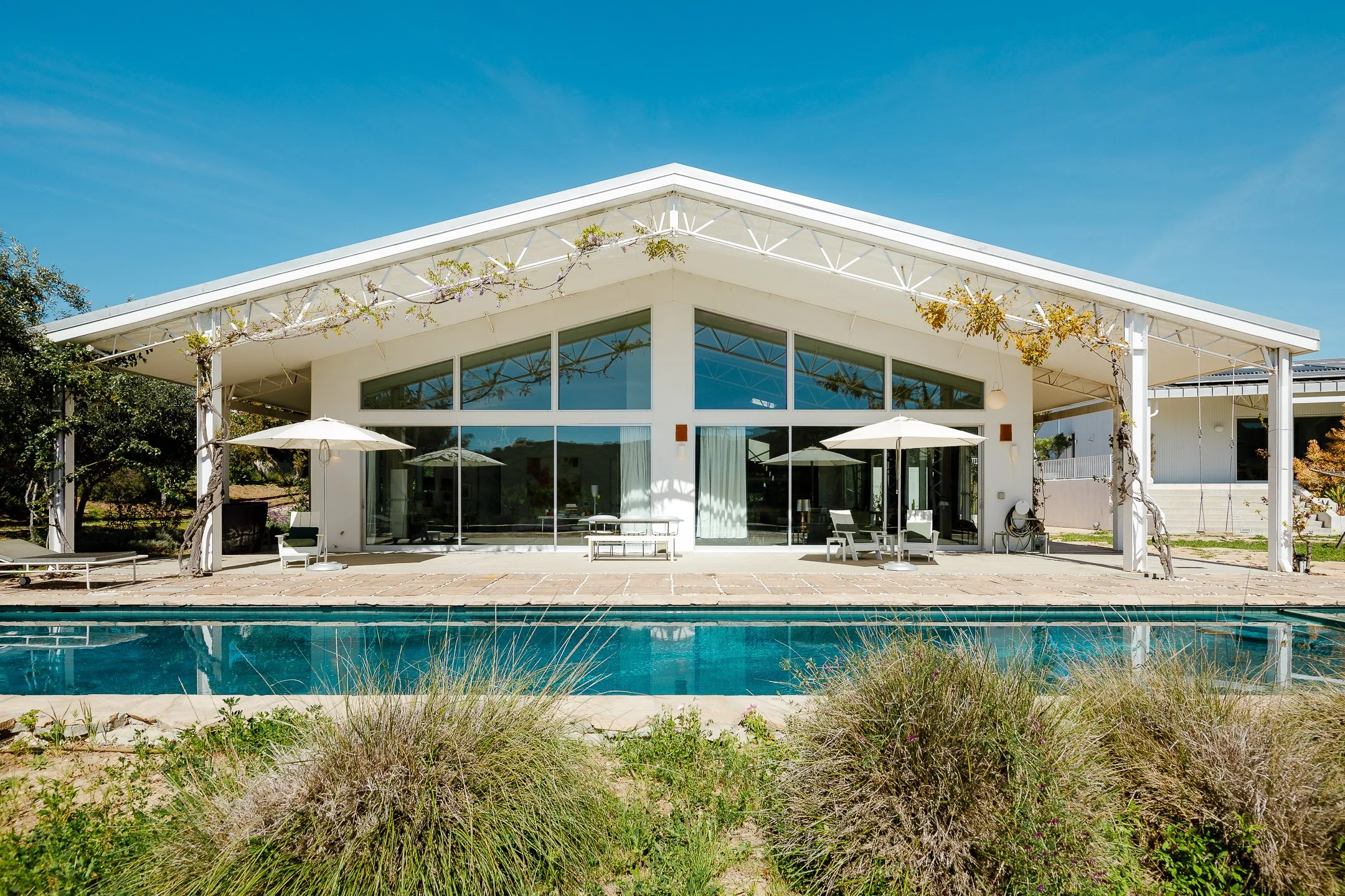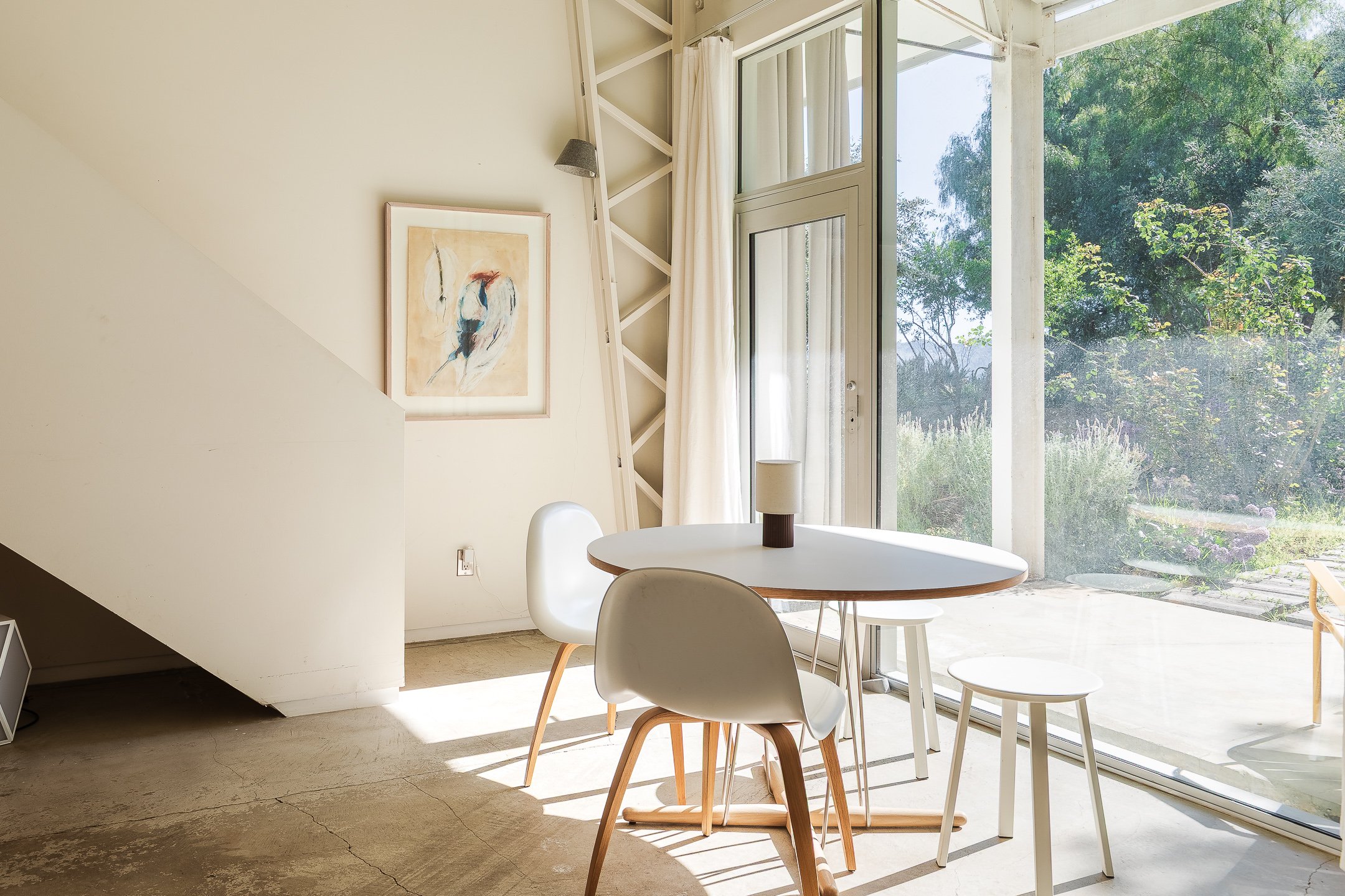 At the top of the hill, on an extraordinary 60,000 sqft site with panoramic views of the canyon and rolling hills, sits this architectural estate designed in 2007 by Barbara Bestor. Two buildings are positioned side by side, forming an entrance promenade and an open patio between them. The main house, spanning 3,951 sqft, features expansive double-height spaces and an open floor plan. It is only partially divided by a series of walls that define the primary bedroom and bathroom, as well as a loft with several office/bedroom spaces and an additional guest suite with its own kitchen. All rooms on the main level have direct access to the outdoors with private garden areas. The main living area, including the kitchen and dining, shares a double fireplace with the adjacent primary bedroom. Both face a pool that runs the length of the house and overlooks the canyon. A 12-foot-deep shaded porch creates a transitional space between indoors and outdoors, ideal for lounging and embracing a daytime outdoor lifestyle. The guesthouse, or "Moon Suite" (679 sq ft), is a fully independent unit with a bedroom, bathroom, kitchen area, and living room - all oriented towards the view. At the rear of the structure, there is also a large studio with storage space that could be used as a 3-4 car garage. The owners' desire for a sustainable home led to the use of structural steel trusses and a custom-adapted prefabricated system, allowing for wide spans and open spaces. Passive temperature control supports year-round heating and cooling (now supplemented by additional AC units), while large custom windows are coated with a low-emissivity transparent metallic film. The white metal facade reflects light, reducing heat gain. The house features very high ceilings inspired by vernacular agrarian shed structures and includes solar panels, radiant heating, and a variety of peach, pear, and olive trees on the property. This special compound, offering multiple possibilities for an artist/wellness retreat, is on the market for the first time and represents one of the few sustainable designs by Barbara Bestor ever available for sale.