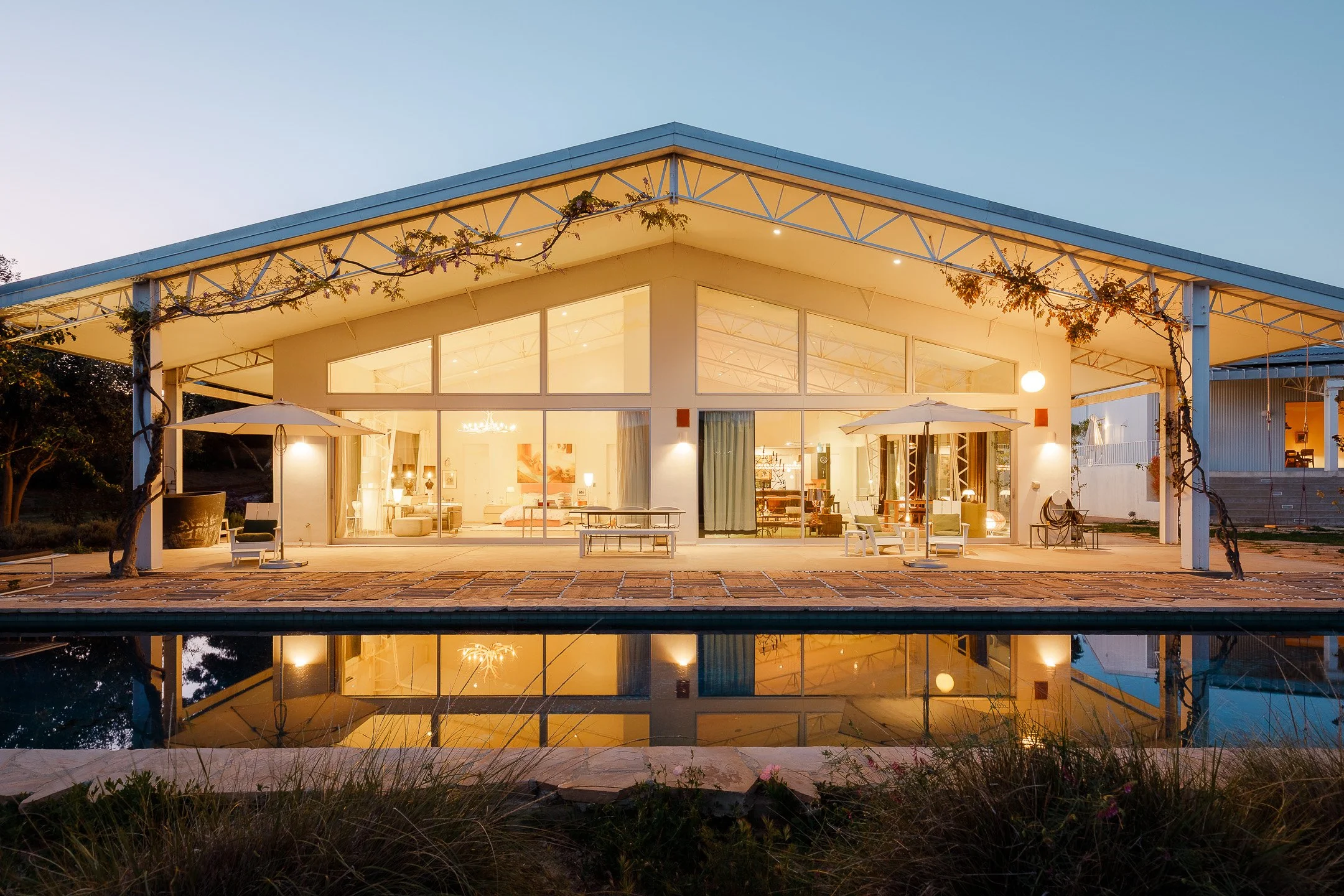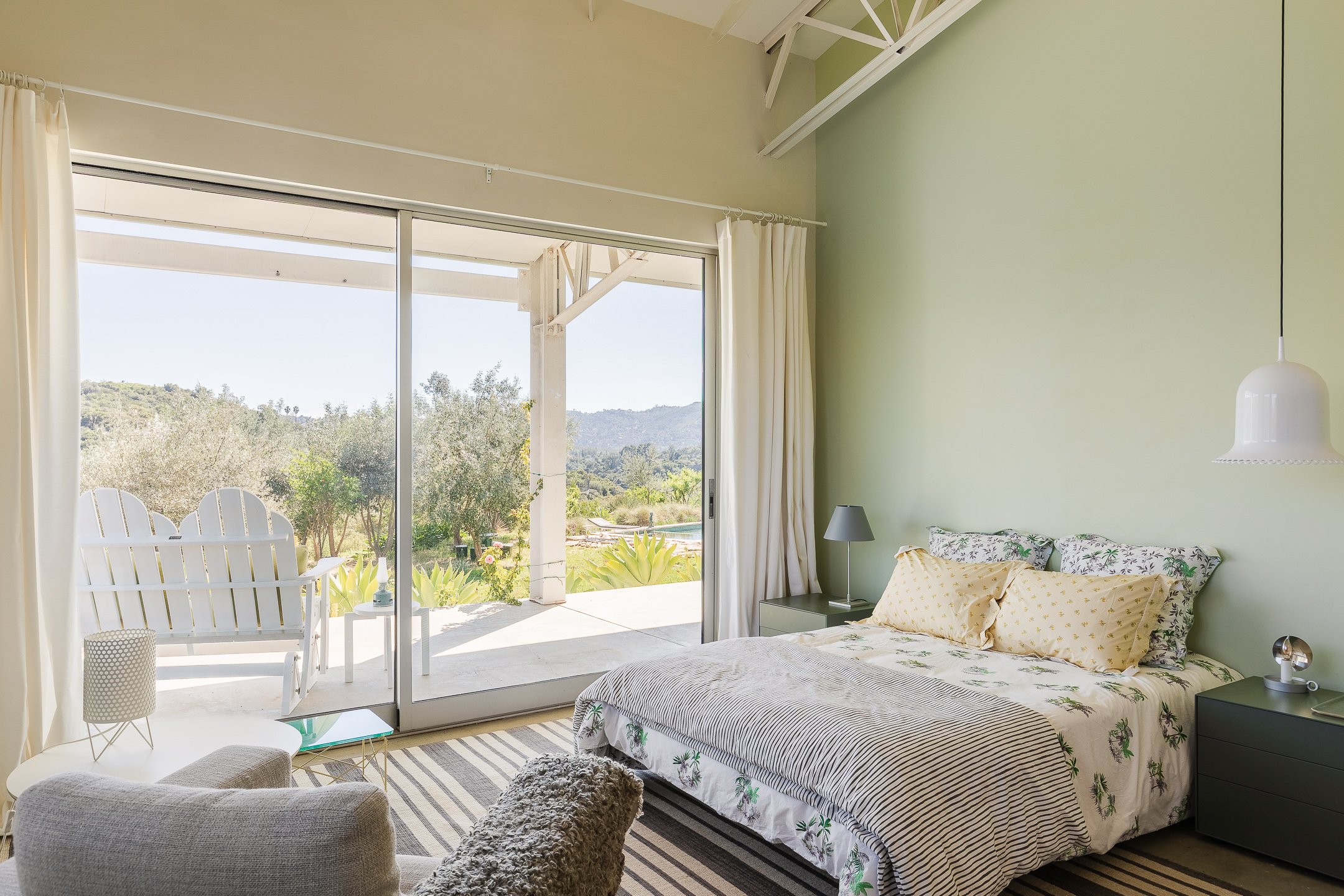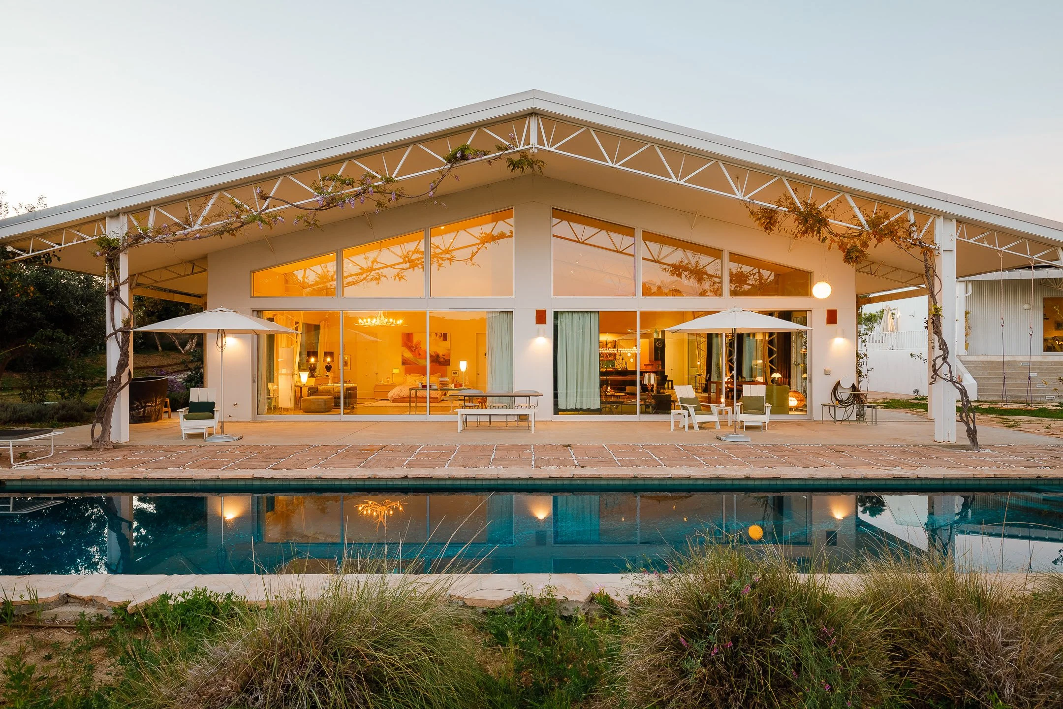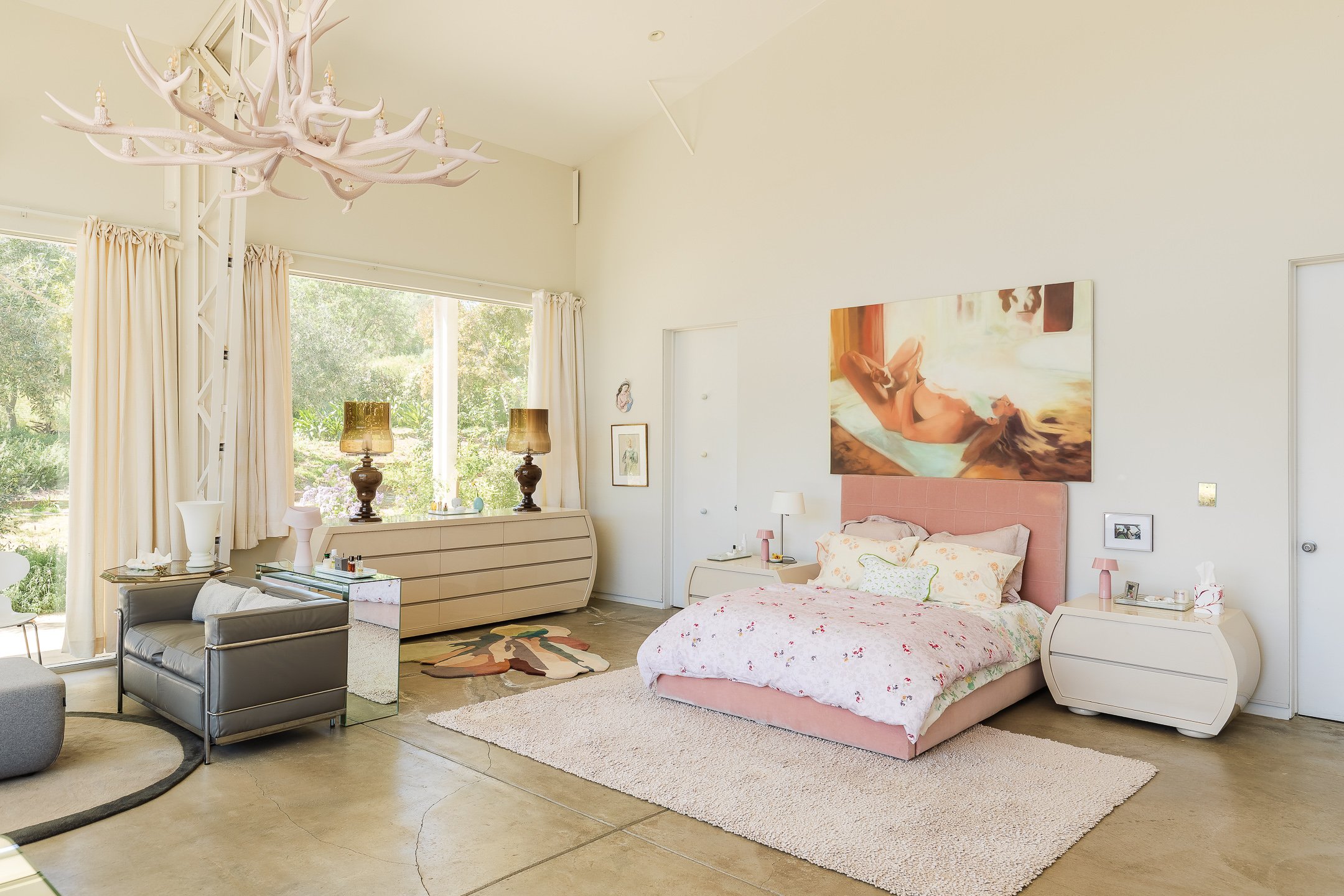 At the top of the hill, on an extraordinary 60,000 sqft site with panoramic views of the canyon and rolling hills, sits this architectural estate designed in 2007 by Barbara Bestor. Two buildings are positioned side by side, forming an entrance promenade and an open patio between them. The main house, spanning 3,951 sqft, features expansive double-height spaces and an open floor plan. It is only partially divided by a series of walls that define the primary bedroom and bathroom, as well as a loft with several office/bedroom spaces and an additional guest suite with its own kitchen. All rooms on the main level have direct access to the outdoors with private garden areas. The main living area, including the kitchen and dining, shares a double fireplace with the adjacent primary bedroom. Both face a pool that runs the length of the house and overlooks the canyon. A 12-foot-deep shaded porch creates a transitional space between indoors and outdoors, ideal for lounging and embracing a daytime outdoor lifestyle. The guesthouse, or "Moon Suite" (679 sq ft), is a fully independent unit with a bedroom, bathroom, kitchen area, and living room - all oriented towards the view. At the rear of the structure, there is also a large studio with storage space that could be used as a 3-4 car garage. The owners' desire for a sustainable home led to the use of structural steel trusses and a custom-adapted prefabricated system, allowing for wide spans and open spaces. Passive temperature control supports year-round heating and cooling (now supplemented by additional AC units), while large custom windows are coated with a low-emissivity transparent metallic film. The white metal facade reflects light, reducing heat gain. The house features very high ceilings inspired by vernacular agrarian shed structures and includes solar panels, radiant heating, and a variety of peach, pear, and olive trees on the property. This special compound, offering multiple possibilities for an artist/wellness retreat, is on the market for the first time and represents one of the few sustainable designs by Barbara Bestor ever available for sale.
