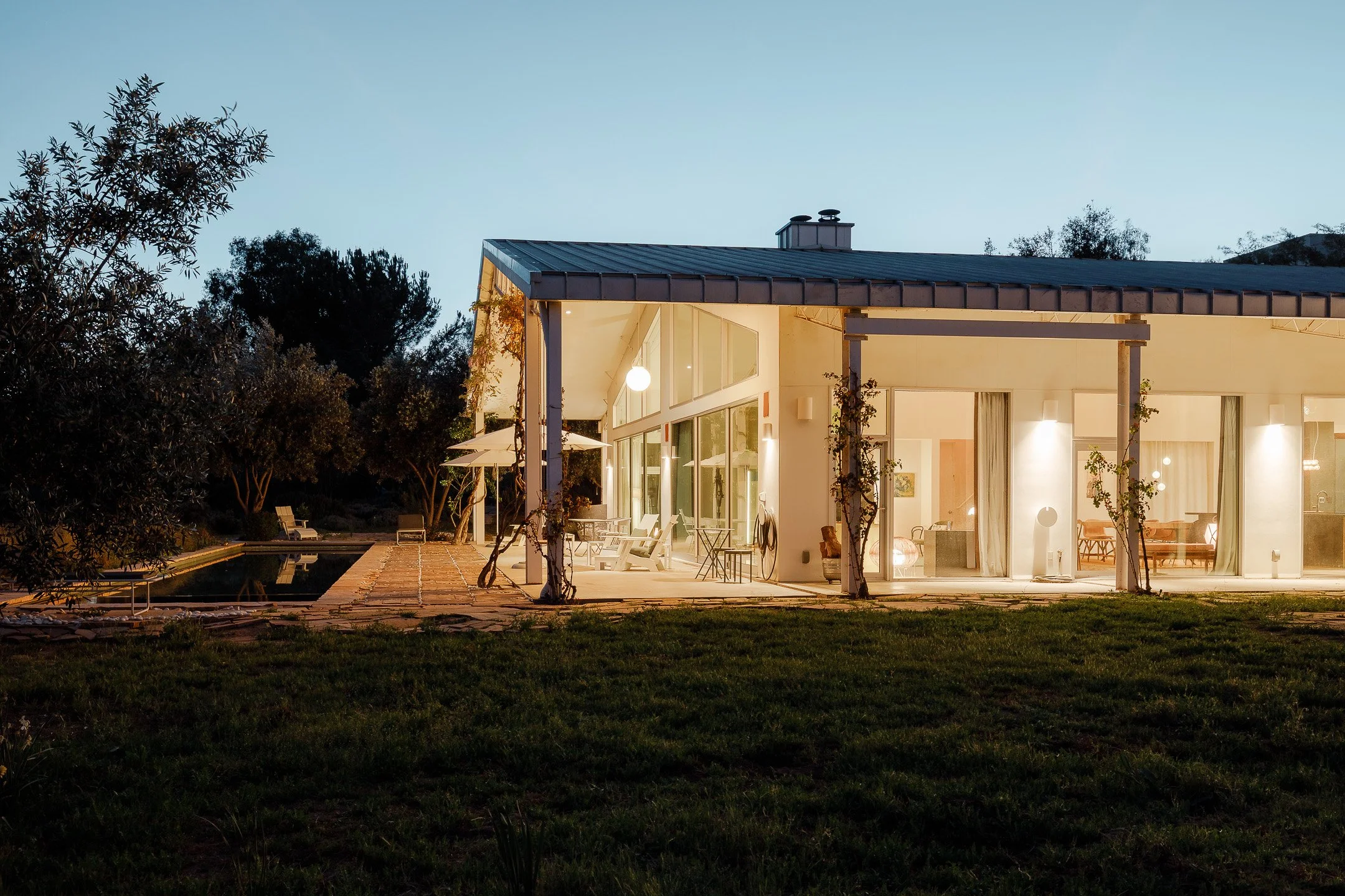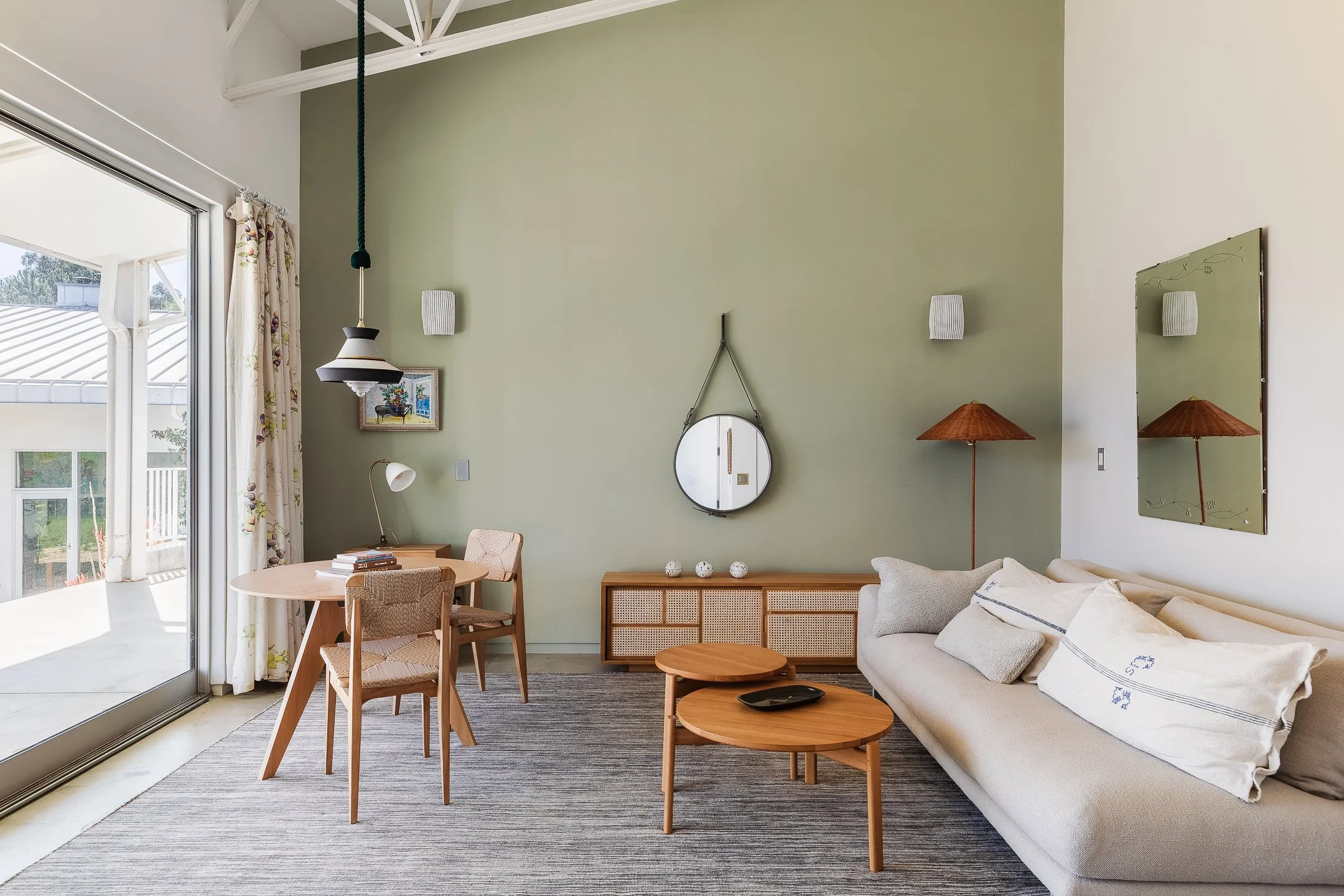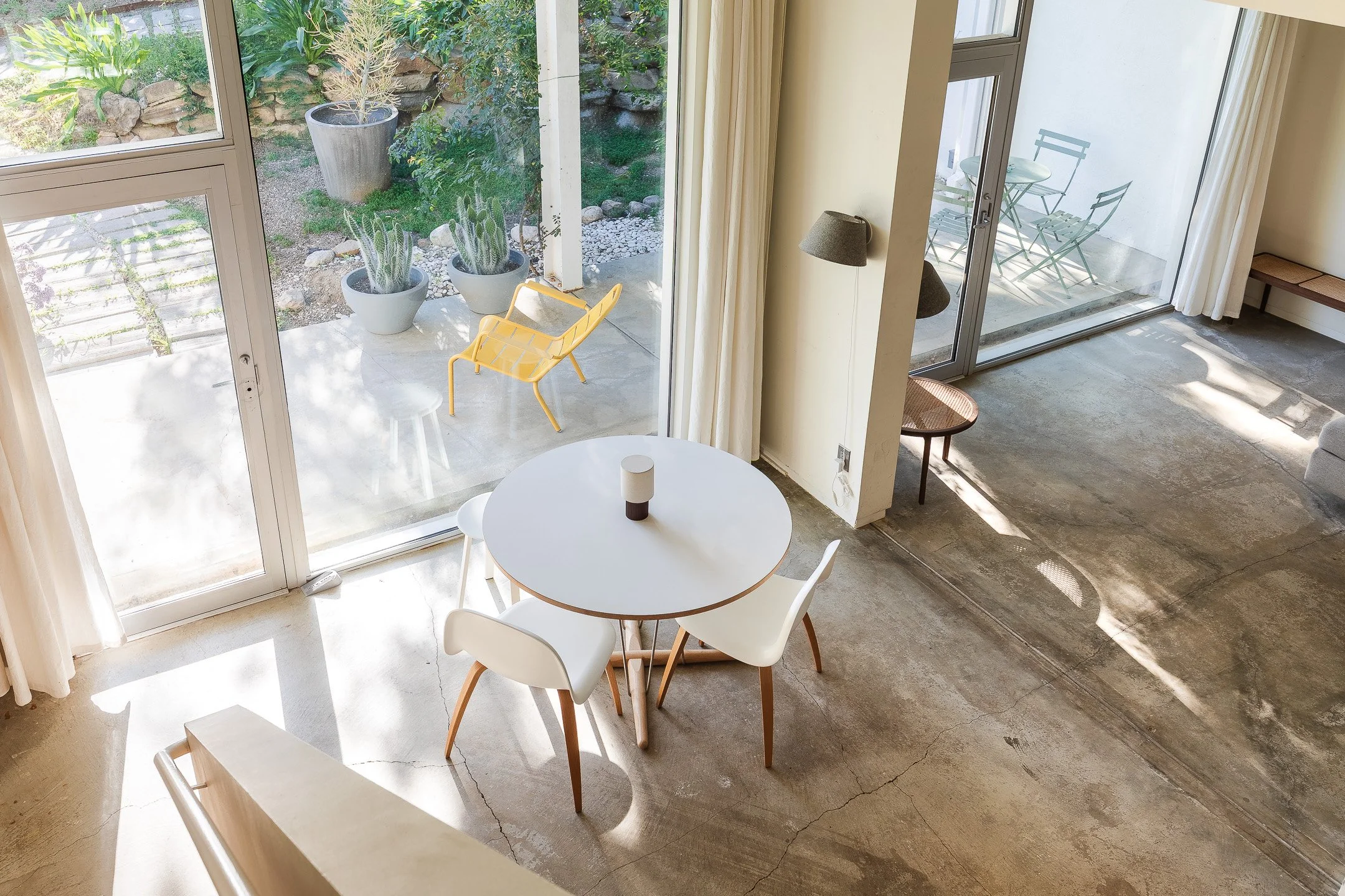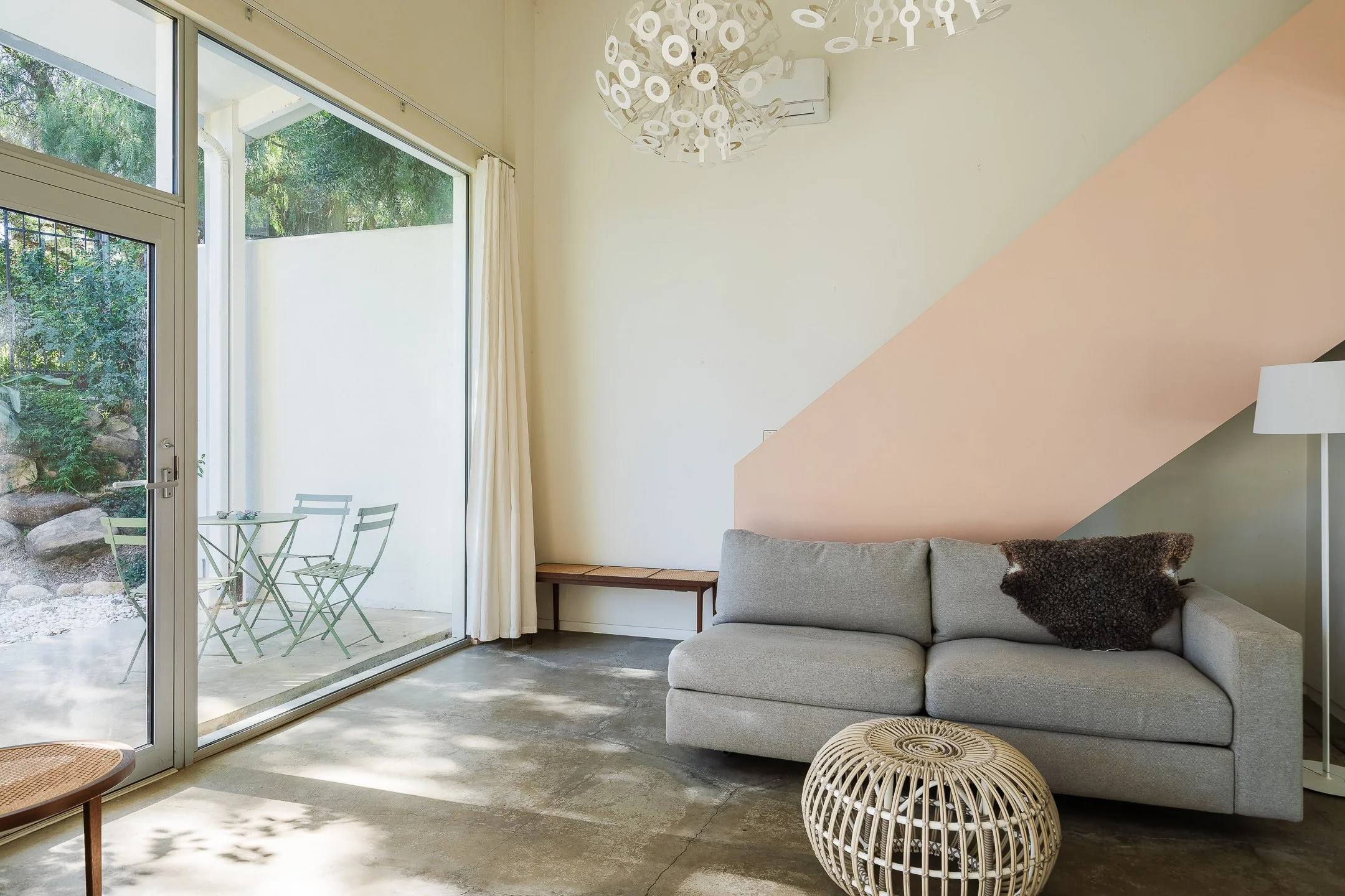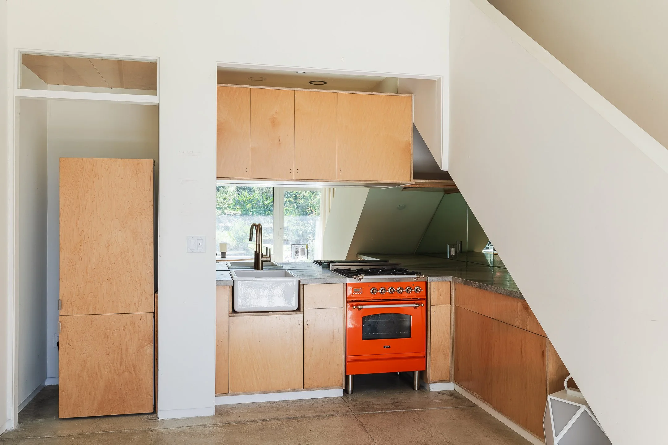 At the top of the hill, on an extraordinary 60,000 sqft site with panoramic views of the canyon and rolling hills, sits this architectural estate designed in 2007 by Barbara Bestor. Two buildings are positioned side by side, forming an entrance promenade and an open patio between them. The main house, spanning 3,951 sqft, features expansive double-height spaces and an open floor plan. It is only partially divided by a series of walls that define the primary bedroom and bathroom, as well as a loft with several office/bedroom spaces and an additional guest suite with its own kitchen. All rooms on the main level have direct access to the outdoors with private garden areas. The main living area, including the kitchen and dining, shares a double fireplace with the adjacent primary bedroom. Both face a pool that runs the length of the house and overlooks the canyon. A 12-foot-deep shaded porch creates a transitional space between indoors and outdoors, ideal for lounging and embracing a daytime outdoor lifestyle. The guesthouse, or "Moon Suite" (679 sq ft), is a fully independent unit with a bedroom, bathroom, kitchen area, and living room - all oriented towards the view. At the rear of the structure, there is also a large studio with storage space that could be used as a 3-4 car garage. The owners' desire for a sustainable home led to the use of structural steel trusses and a custom-adapted prefabricated system, allowing for wide spans and open spaces. Passive temperature control supports year-round heating and cooling (now supplemented by additional AC units), while large custom windows are coated with a low-emissivity transparent metallic film. The white metal facade reflects light, reducing heat gain. The house features very high ceilings inspired by vernacular agrarian shed structures and includes solar panels, radiant heating, and a variety of peach, pear, and olive trees on the property. This special compound, offering multiple possibilities for an artist/wellness retreat, is on the market for the first time and represents one of the few sustainable designs by Barbara Bestor ever available for sale.