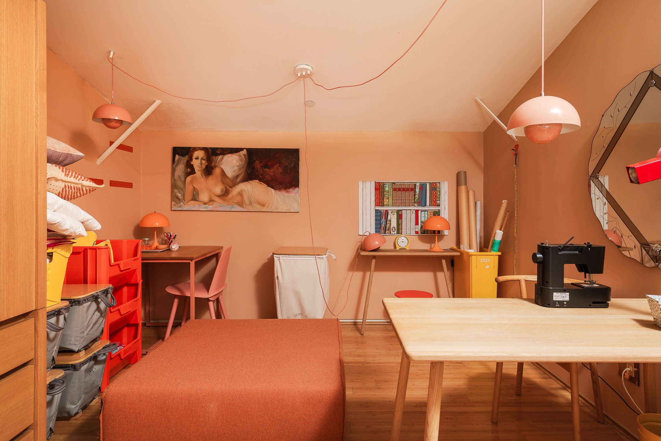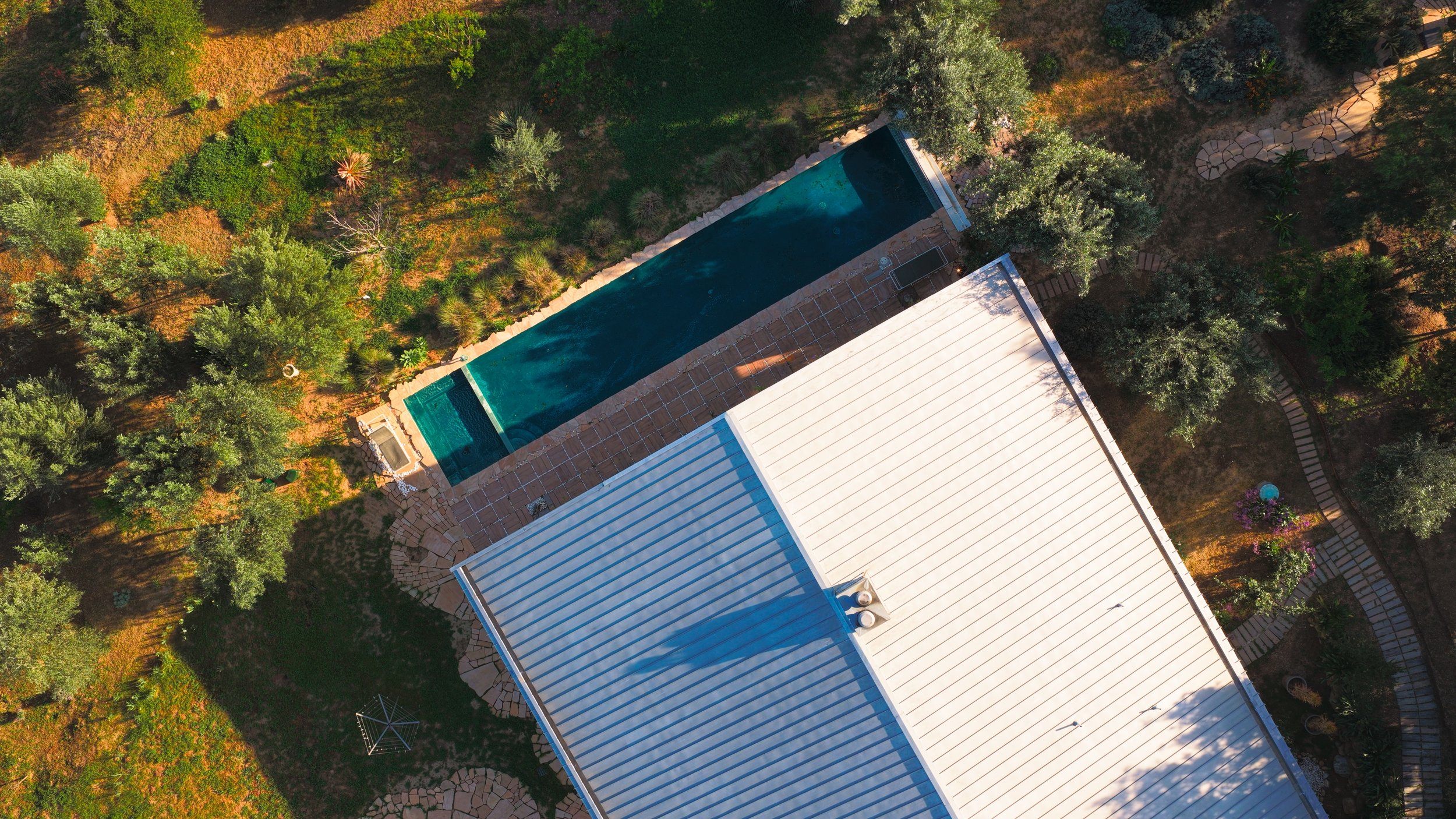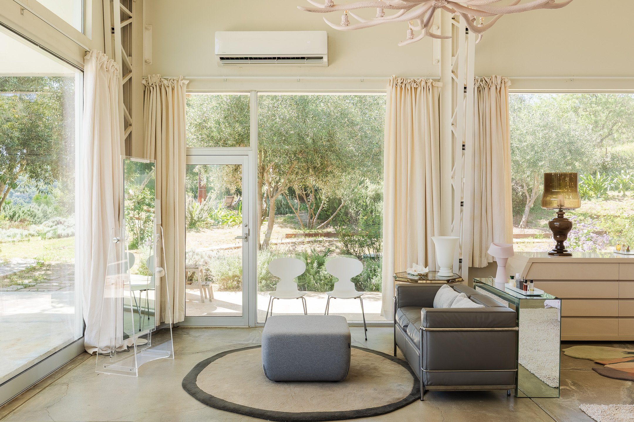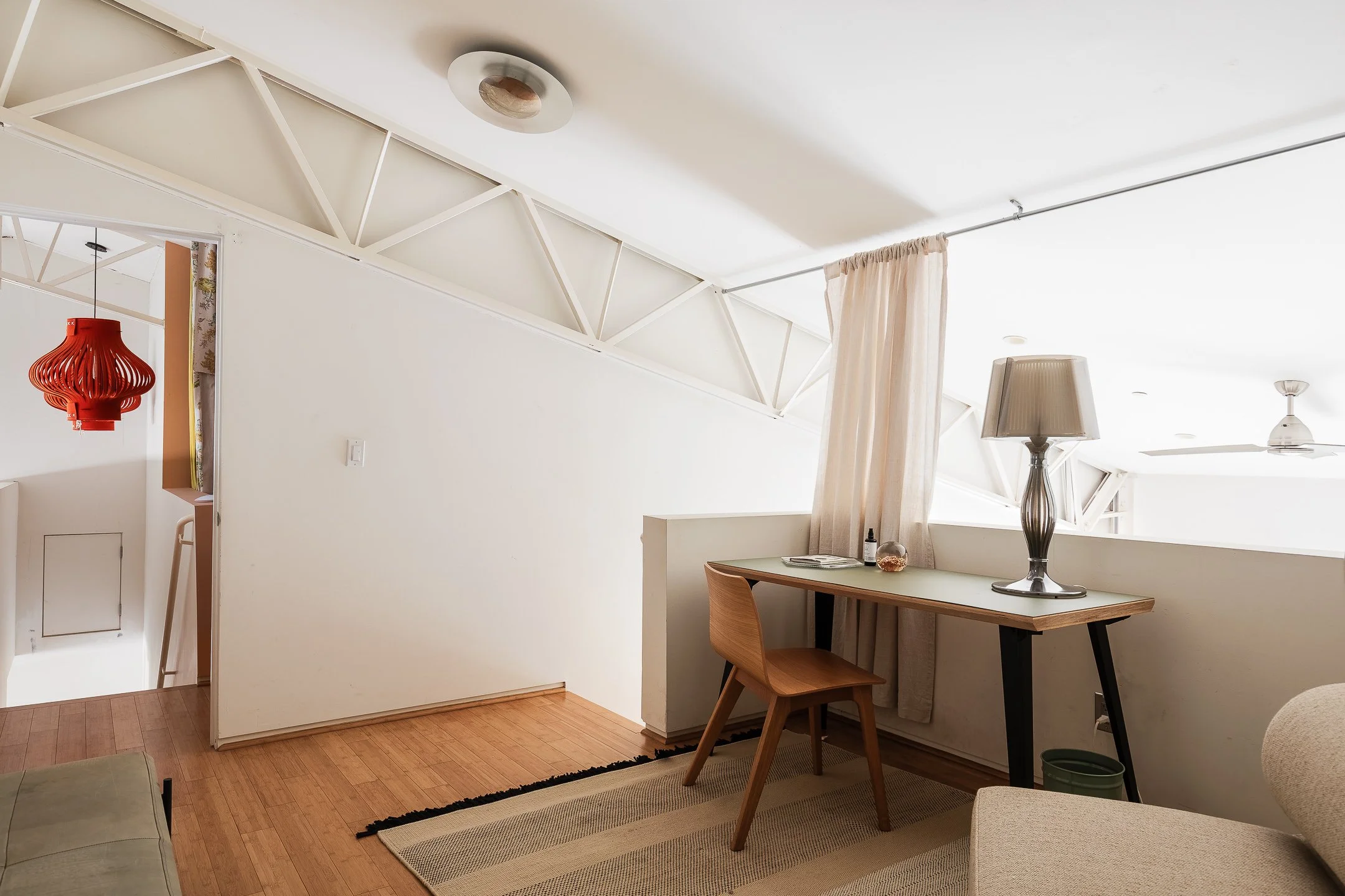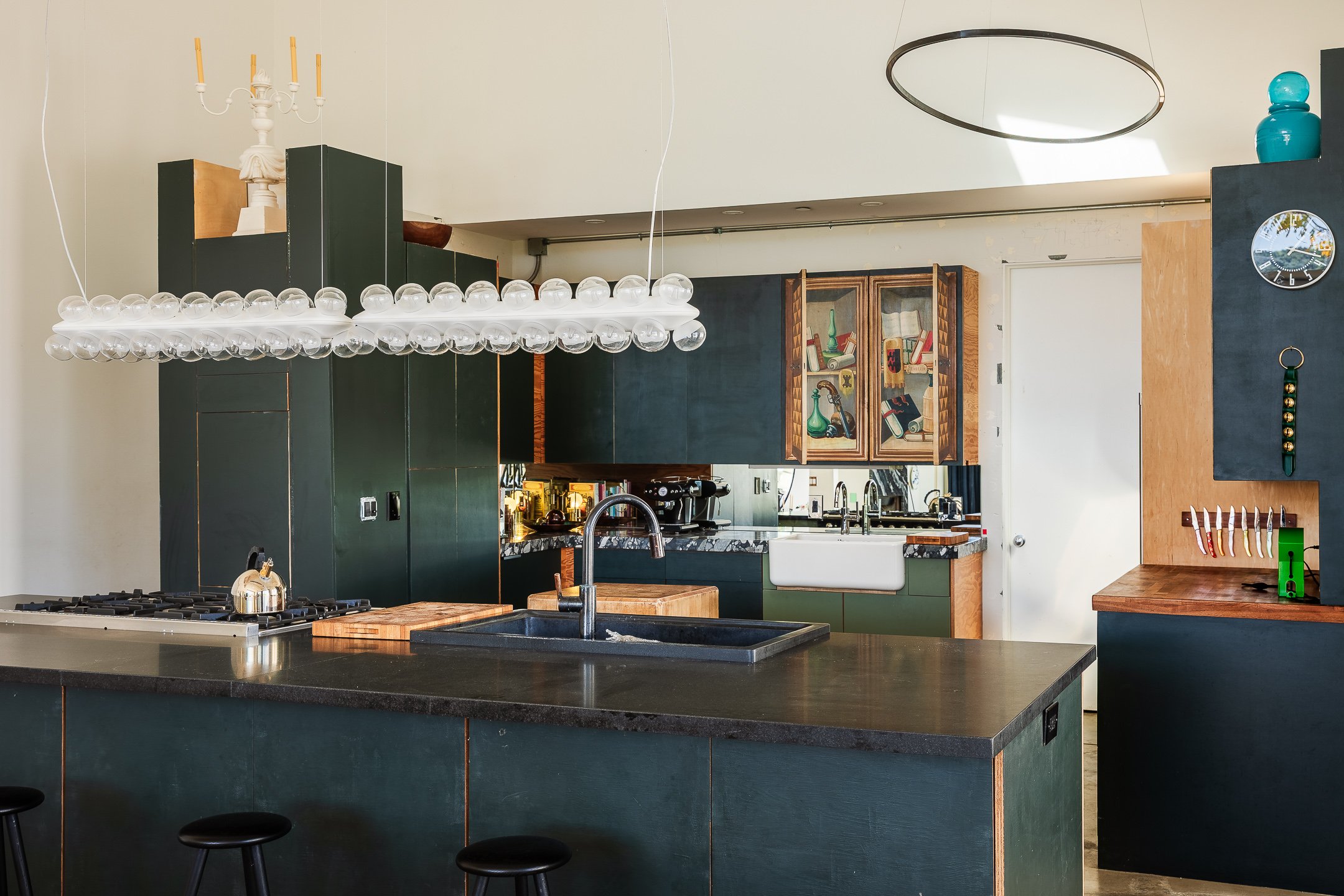 At the top of the hill, on an extraordinary 60,000 sqft site with panoramic views of the canyon and rolling hills, sits this architectural estate designed in 2007 by Barbara Bestor. Two buildings are positioned side by side, forming an entrance promenade and an open patio between them. The main house, spanning 3,951 sqft, features expansive double-height spaces and an open floor plan. It is only partially divided by a series of walls that define the primary bedroom and bathroom, as well as a loft with several office/bedroom spaces and an additional guest suite with its own kitchen. All rooms on the main level have direct access to the outdoors with private garden areas. The main living area, including the kitchen and dining, shares a double fireplace with the adjacent primary bedroom. Both face a pool that runs the length of the house and overlooks the canyon. A 12-foot-deep shaded porch creates a transitional space between indoors and outdoors, ideal for lounging and embracing a daytime outdoor lifestyle. The guesthouse, or "Moon Suite" (679 sq ft), is a fully independent unit with a bedroom, bathroom, kitchen area, and living room - all oriented towards the view. At the rear of the structure, there is also a large studio with storage space that could be used as a 3-4 car garage. The owners' desire for a sustainable home led to the use of structural steel trusses and a custom-adapted prefabricated system, allowing for wide spans and open spaces. Passive temperature control supports year-round heating and cooling (now supplemented by additional AC units), while large custom windows are coated with a low-emissivity transparent metallic film. The white metal facade reflects light, reducing heat gain. The house features very high ceilings inspired by vernacular agrarian shed structures and includes solar panels, radiant heating, and a variety of peach, pear, and olive trees on the property. This special compound, offering multiple possibilities for an artist/wellness retreat, is on the market for the first time and represents one of the few sustainable designs by Barbara Bestor ever available for sale.